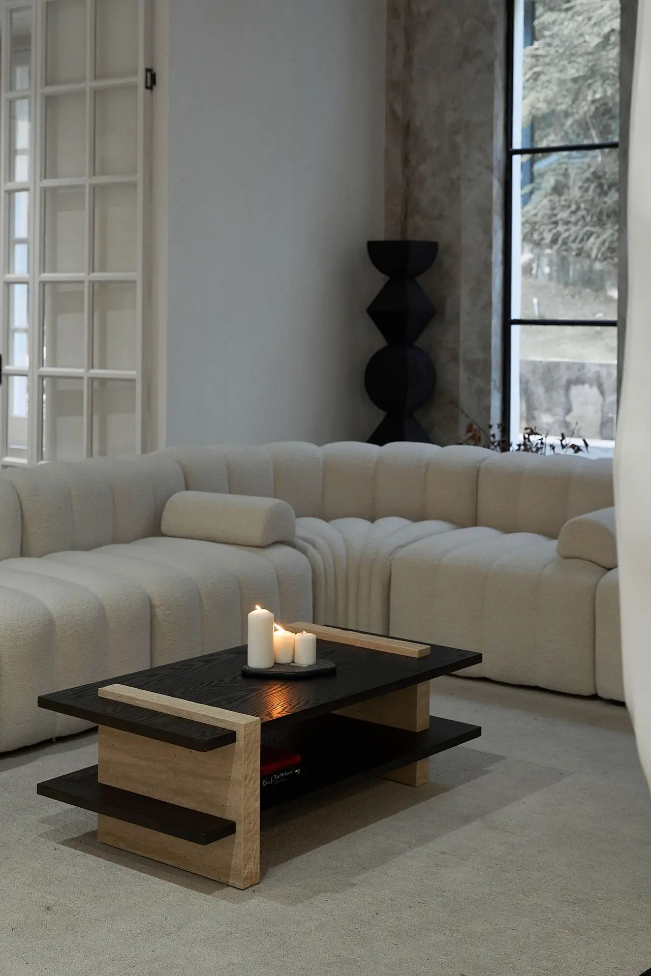 纵横茶几桌腿运用纯天然米白洞石材质,质感温暖且触感舒适,洞石的微妙纹理,犹如大自然的艺术创作,给人以无尽的想象。每块石材边缘都经过工人手工捶打,给每块洞石留下独一无二的自然美感,为空间注入了一份自然、温馨和舒适的氛围。
