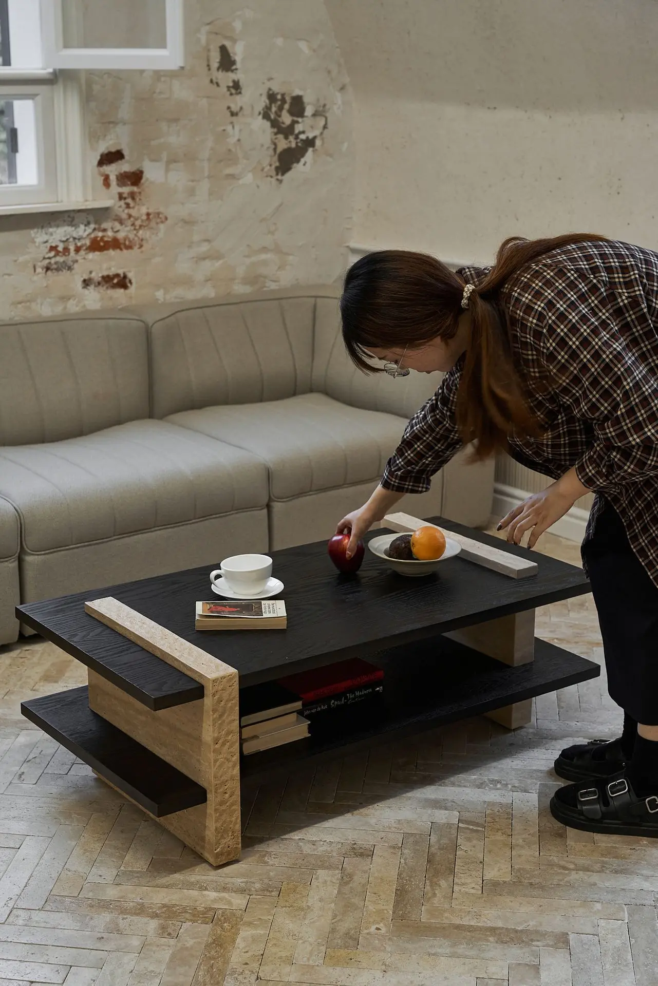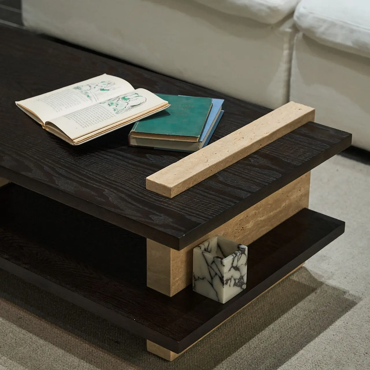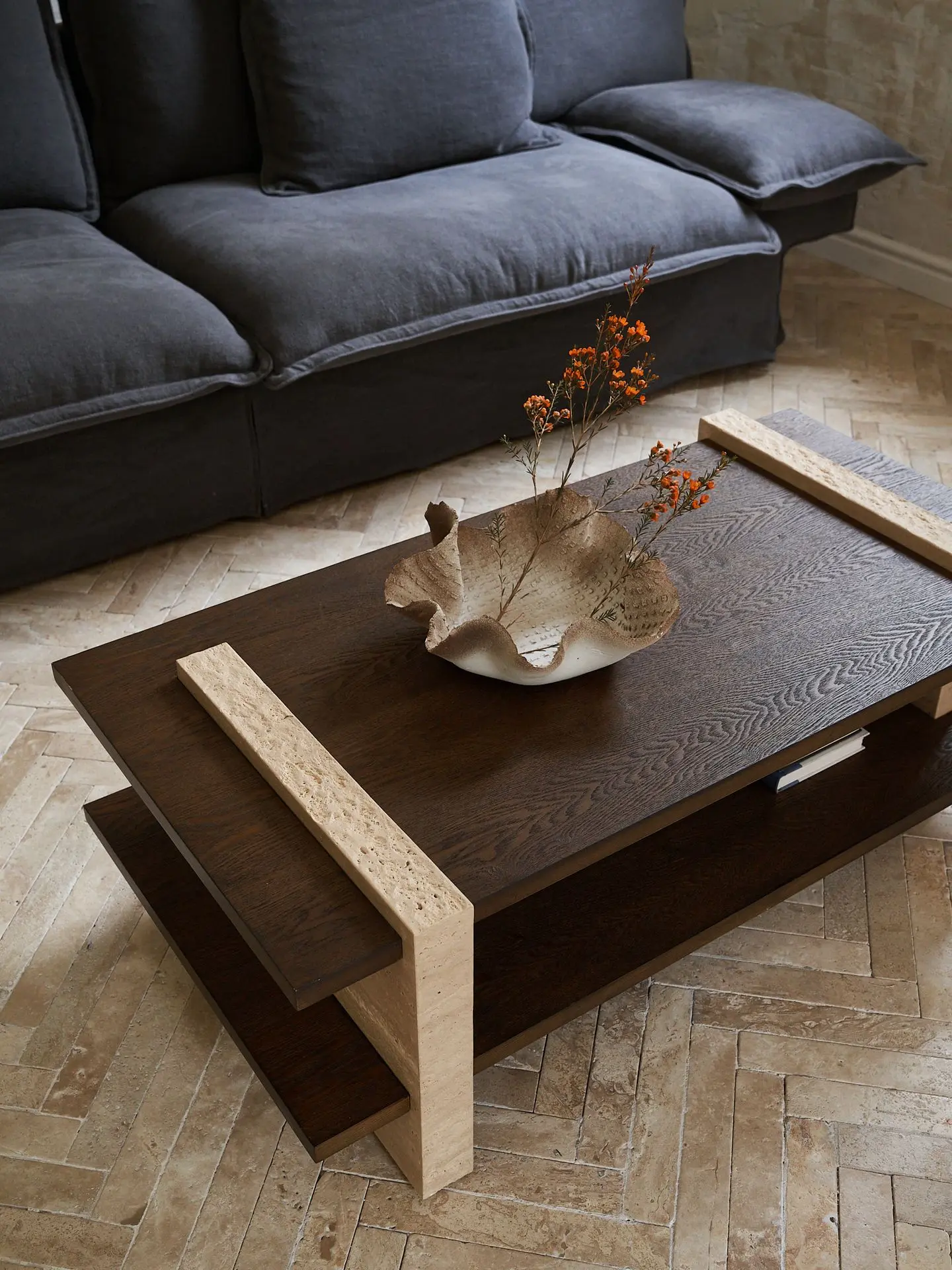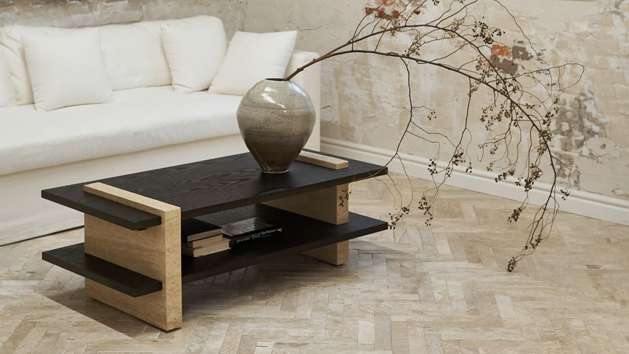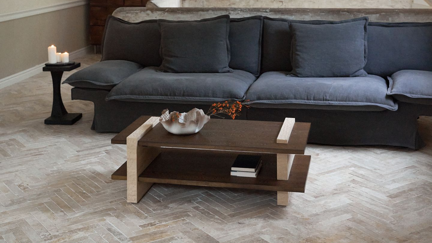 纵横茶几整体造型为体块间的交错搭接,腿部为天然洞石,与木材桌面穿插搭接,呈现四平八稳、纵横交错的建筑美感。洞石边缘采用特殊凿边工艺,将石材的凹凸天然美感放大呈现,自然感的肌理边缘与木材的温暖质感相互交织,无论是置于客厅或者休闲区域,纵横茶几都会给空间带来自然与现代结合的魅力。