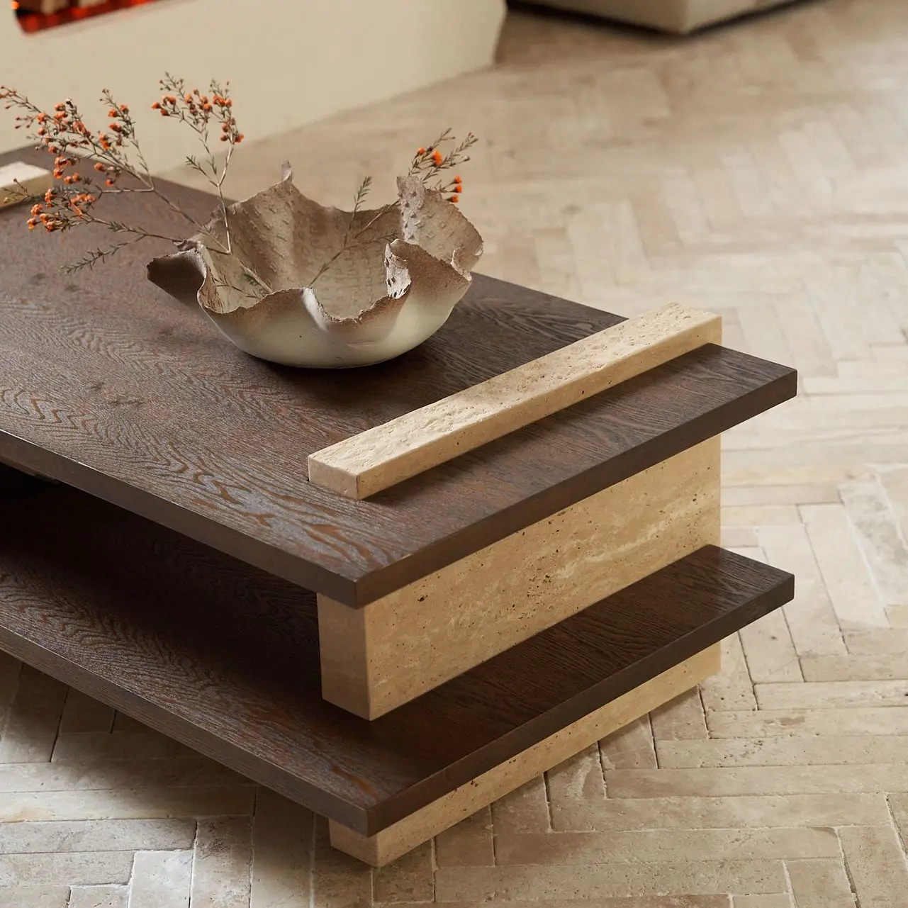 The Zongheng Tea Table features an interlocking and overlapping form of geometric blocks. Its legs are made of natural travertine, which interweaves and joins with the wooden tabletop, presenting a stable and crisscrossing architectural aesthetic. The edges of the travertine are processed with a special chiseling technique, which amplifies the natural concave-convex beauty of the stone. The textured, nature-inspired edges and the warm texture of the wood intertwine seamlessly. Whether placed in the living room or leisure area, the Zongheng Tea Table will bring the charm of a perfect blend of nature and modernity to the space.