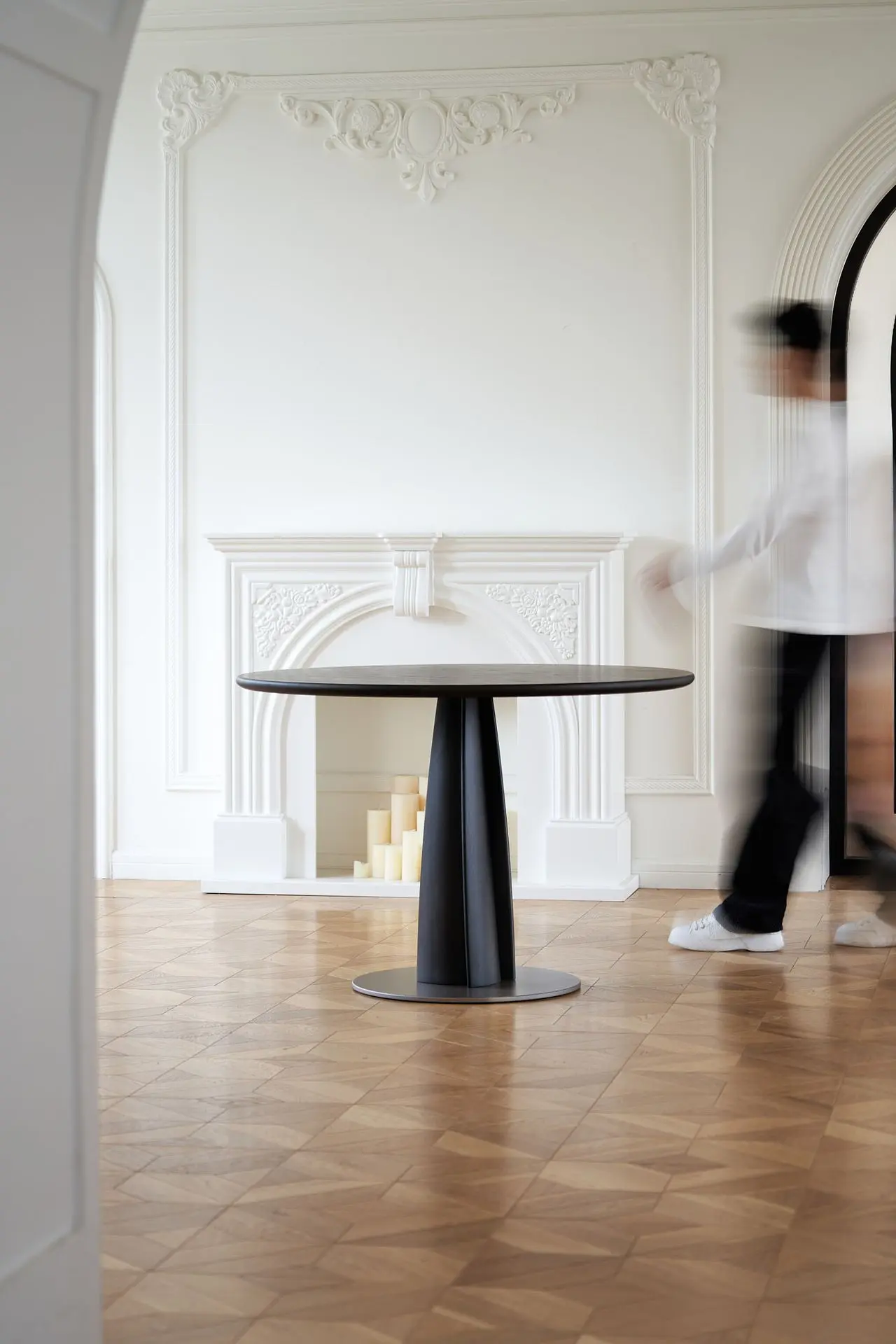 The legs of the Linglong round side table are assembled by interlocking four solid wood blocks with three-dimensional curves. Its tower-shaped design—narrow at the top and wide at the bottom—ensures a well-balanced visual center of gravity, exuding an elegant and vivid dynamic beauty.