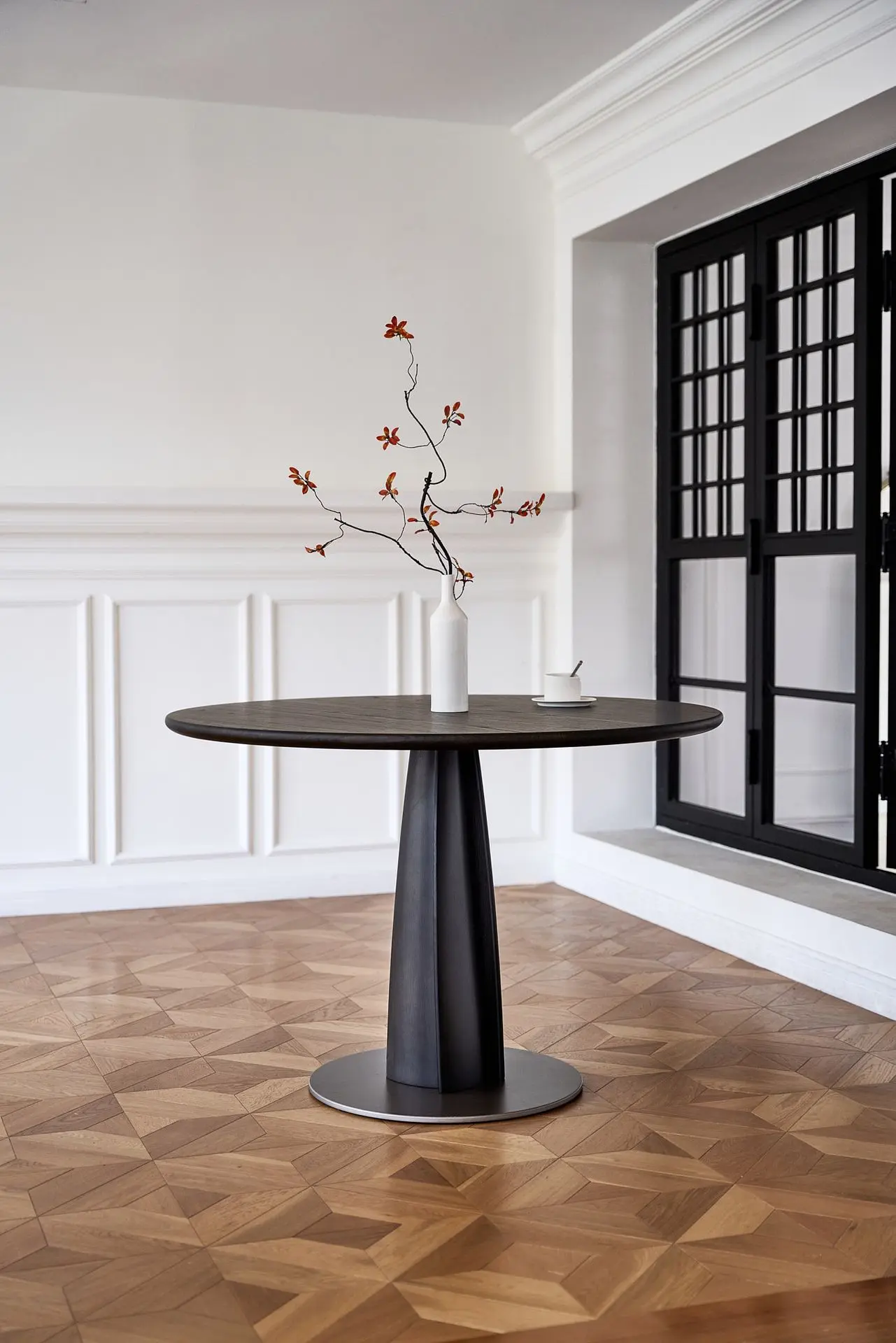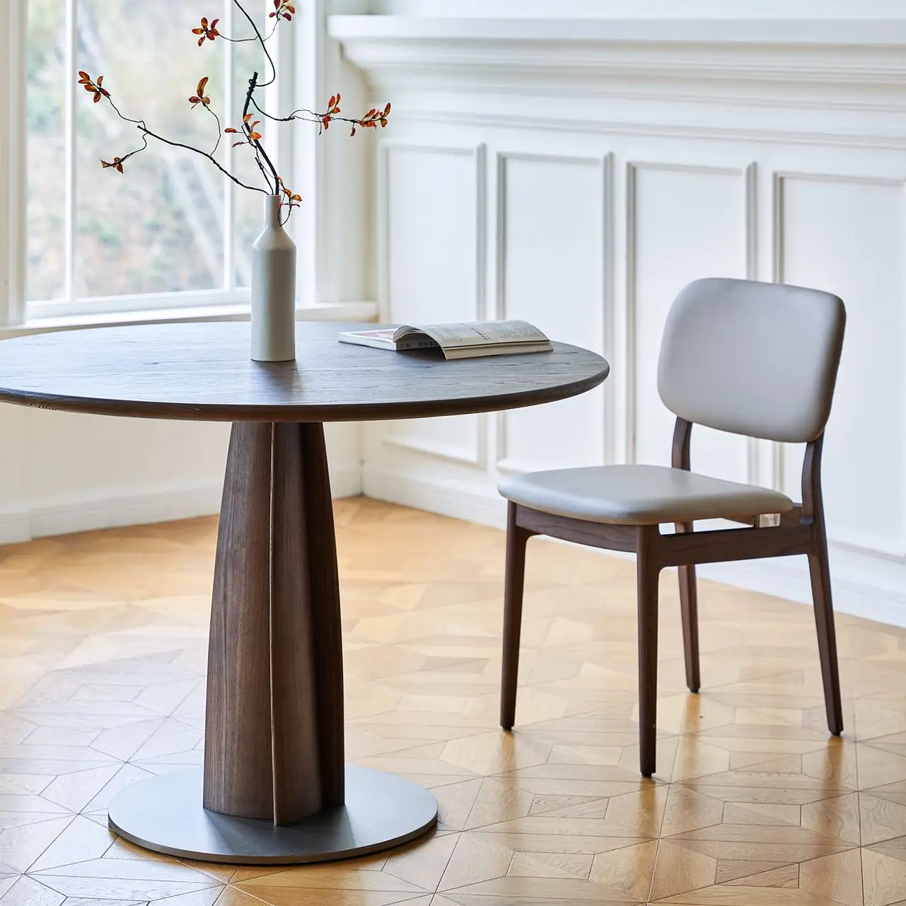 玲珑桌腿顺时针旋转的花瓣造型,其木质温润而富有动感,沉稳厚重却灵动剔透,在任何角度都具备观赏性。无论是在桌上就餐还是工作、独处或相聚,玲珑小圆桌都会让家里充满温馨的氛围。
