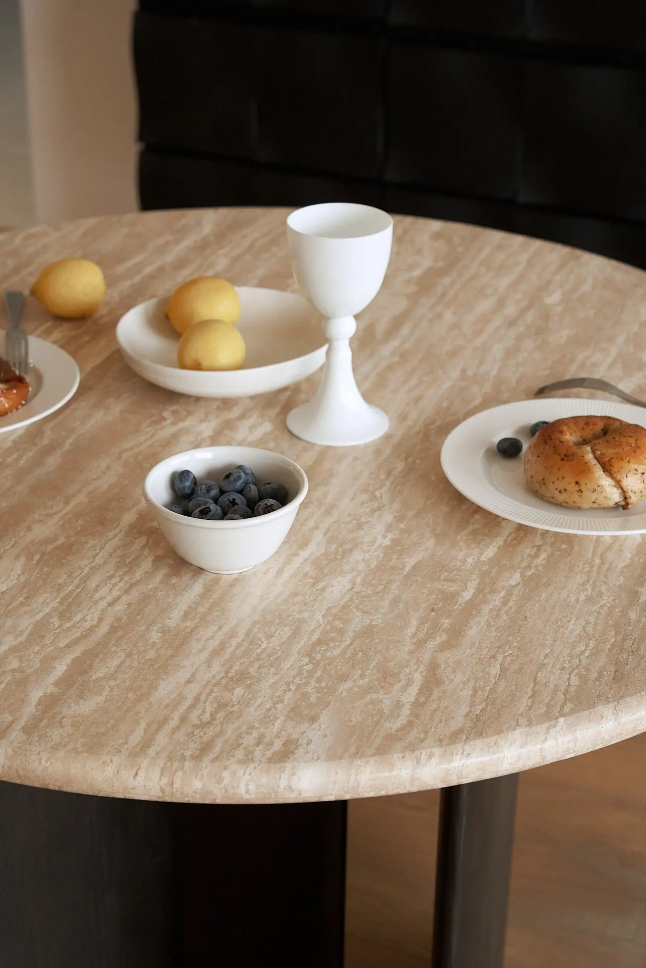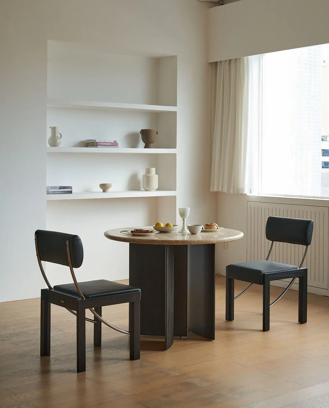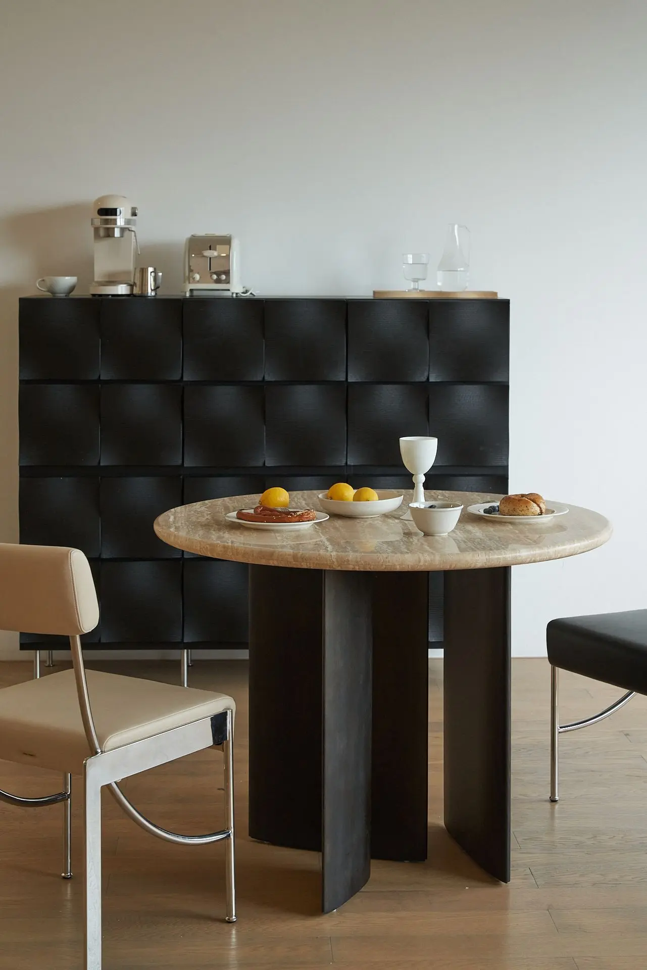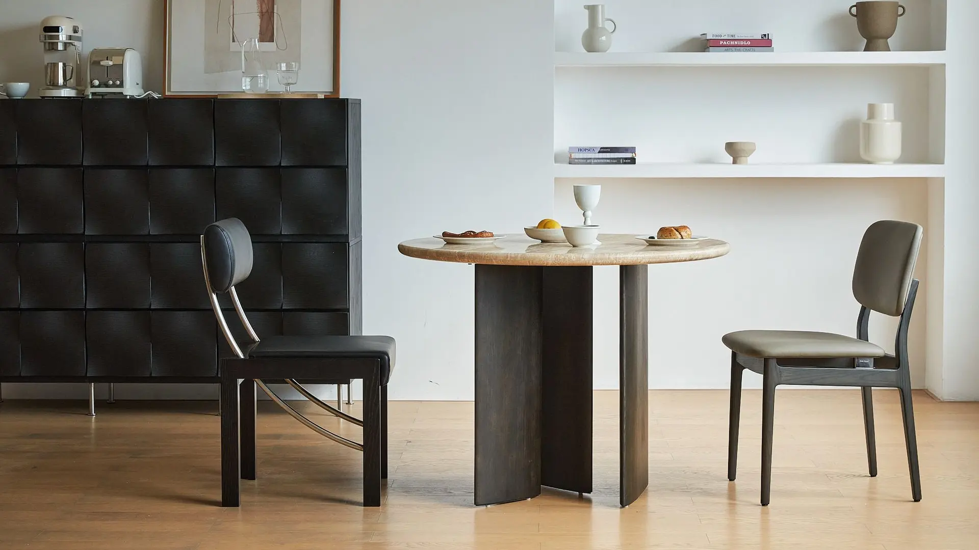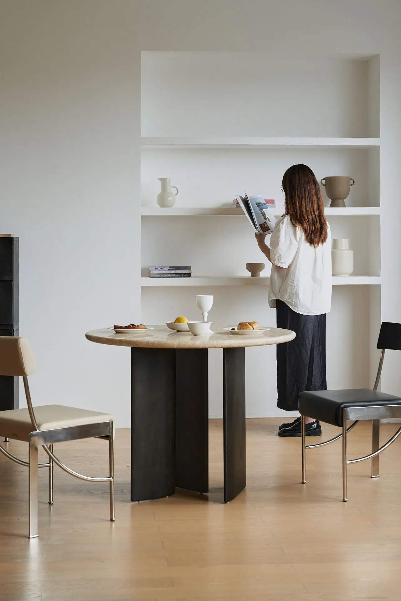 This compact round table with a one-meter diameter seats 4–5 people for daily use and up to 6–7 for friend gatherings, while its tabletop easily accommodates six plates of food. It creates a dining area with a distinct sense of ritual, setting the perfect mood for everything—from family and friend get-togethers and cozy afternoon teas to intimate nightcaps.