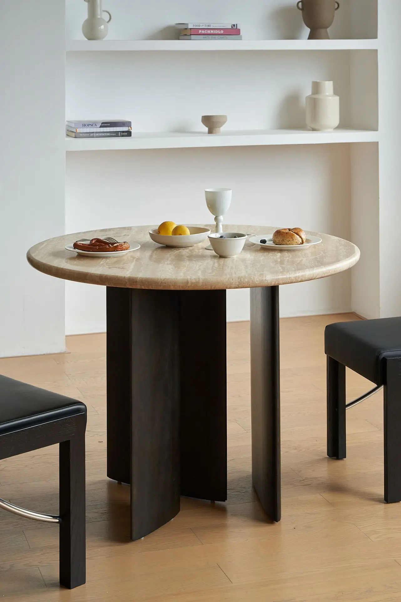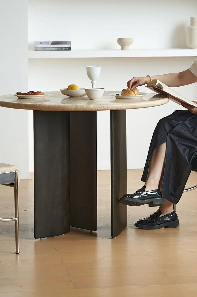 The tabletop is crafted from pure natural off-white travertine, boasting a warm texture and comfortable touch. The subtle veins of the travertine resemble nature’s own artwork, inspiring boundless imagination. Each stone slab features unique natural grains, endowing every dining table with a one-of-a-kind beauty and infusing the space with a natural, cozy and soothing ambiance.