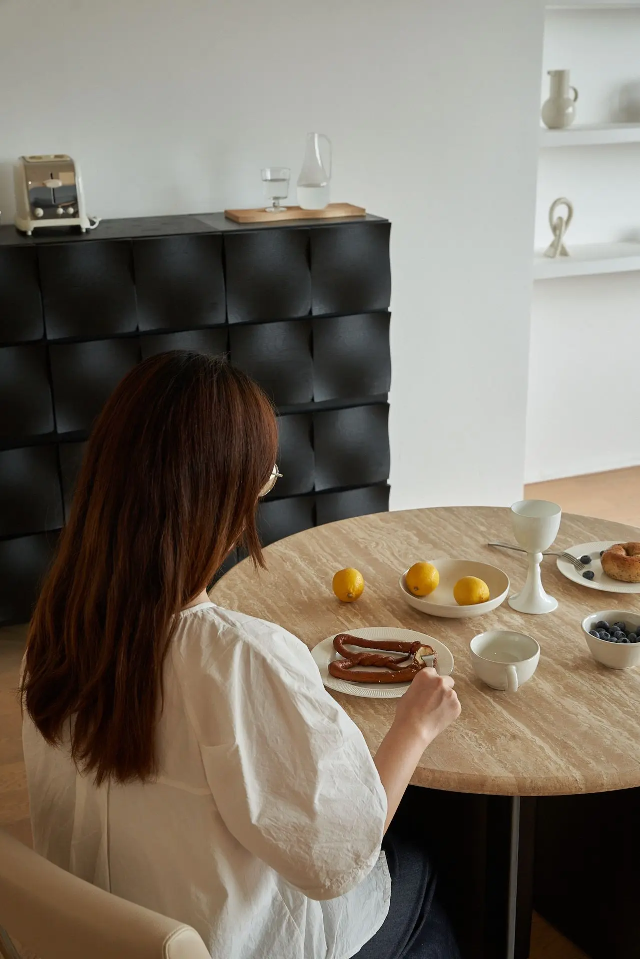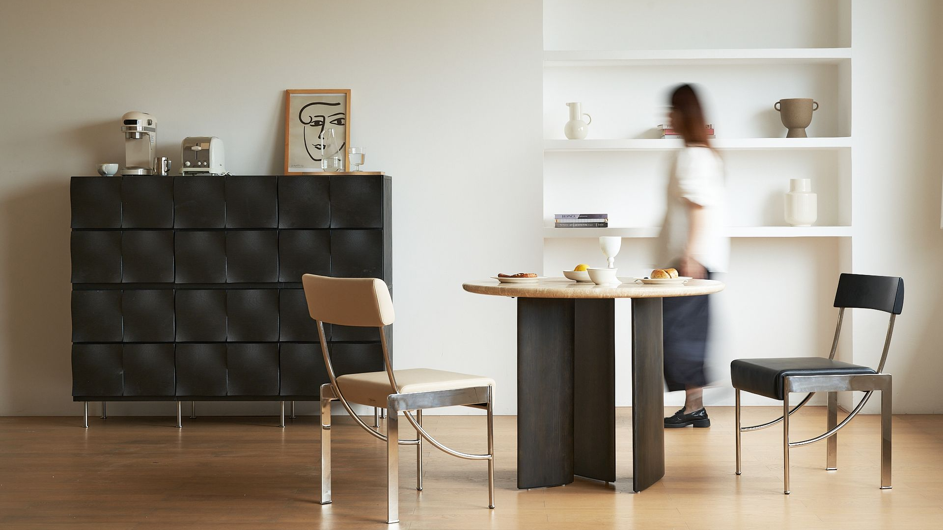 For small dining rooms, round dining tables are far more space-efficient. With a diameter of one meter, it creates nothing but lovely, harmonious scenes at home — whether you’re savoring quiet moments alone, sharing sweet, romantic time with your partner, or enjoying joyful gatherings with your family of three.