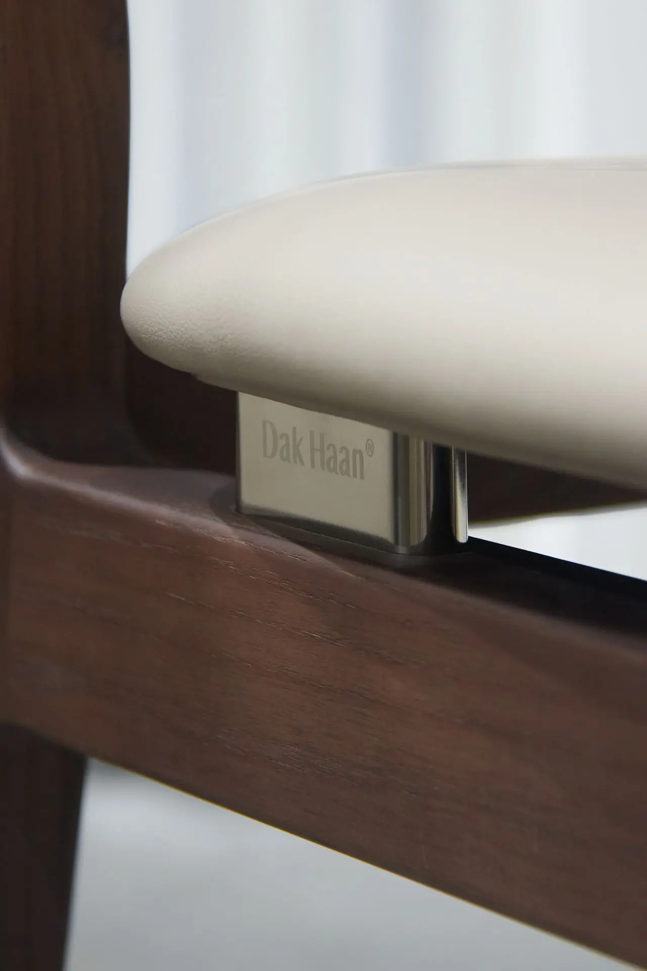 在坐垫与木框架的衔接处,采用亮面不锈钢五金件,并雕刻品牌专属 Logo。镜面质感的金属与温润实木形成材质对比,不仅强化了结构的稳固性,更以精致细节提升整体质感。