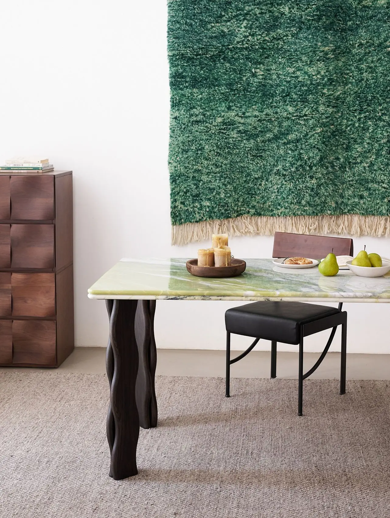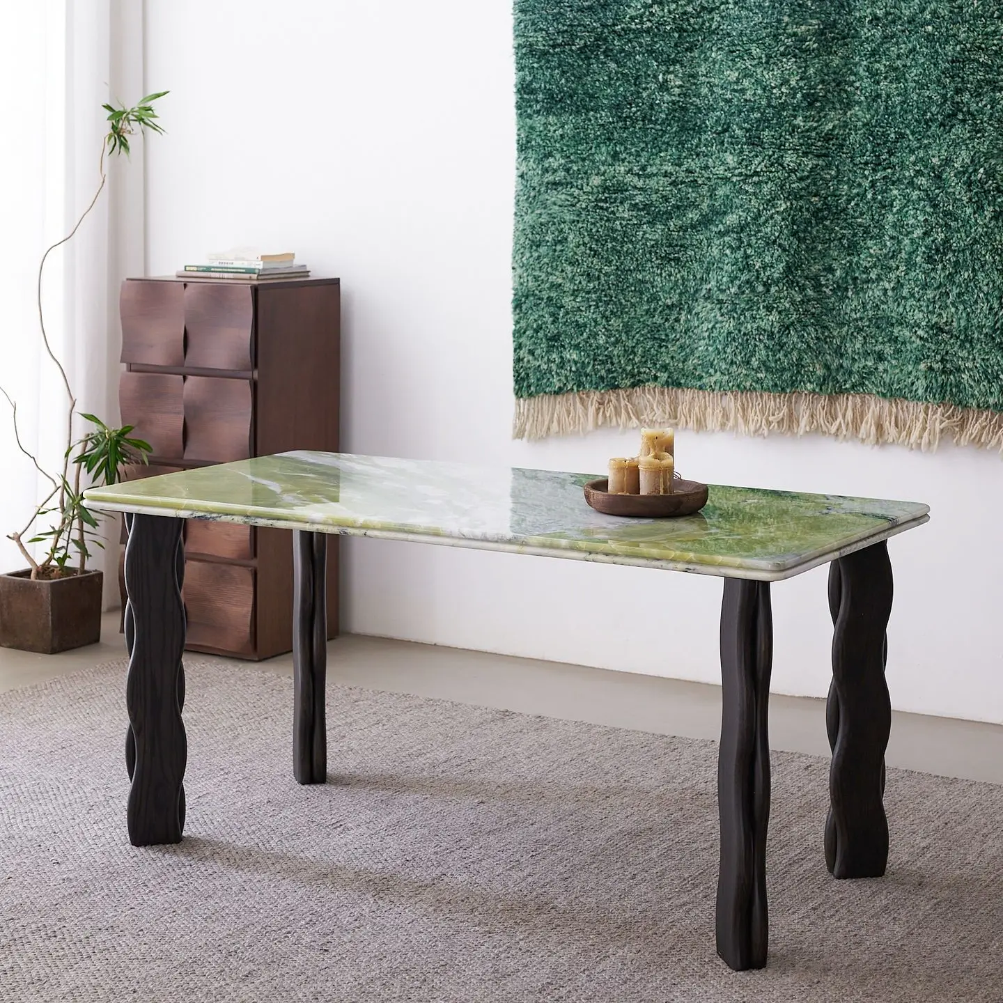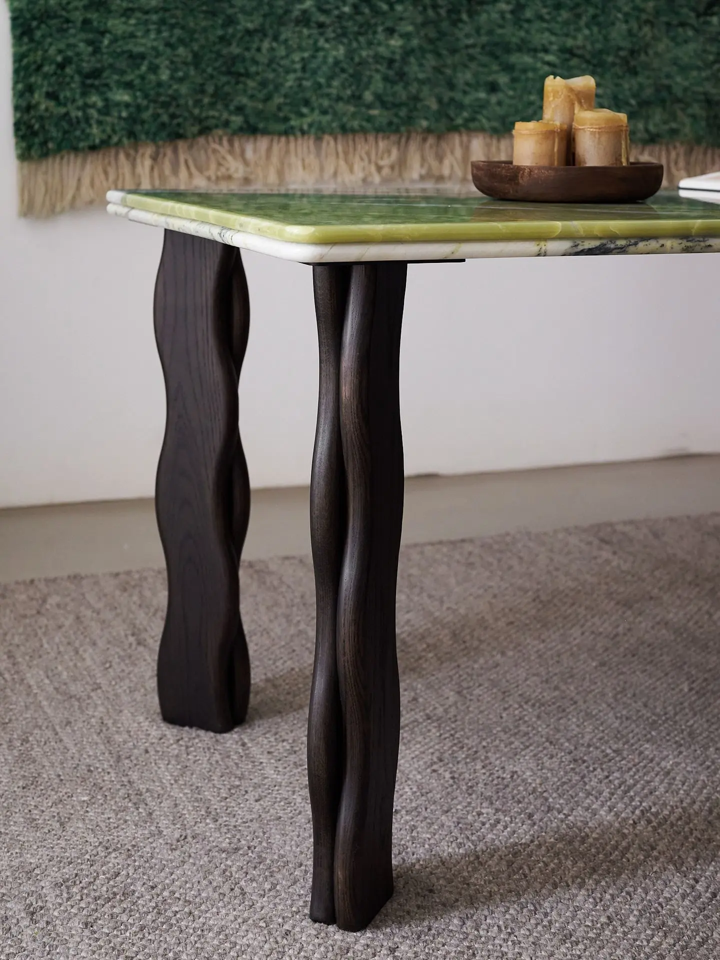 斑斓长桌每个桌腿都由两块块波浪形木材板拼合,构成具有层次感的立体造型,每块木材的曲线均经过细致雕琢,巧妙地捕捉了水波的灵动,仿佛水面在微风中轻轻荡漾,温润木纹结合台面不同天然石材的自然纹理,带来斑斓光影和复古美感。