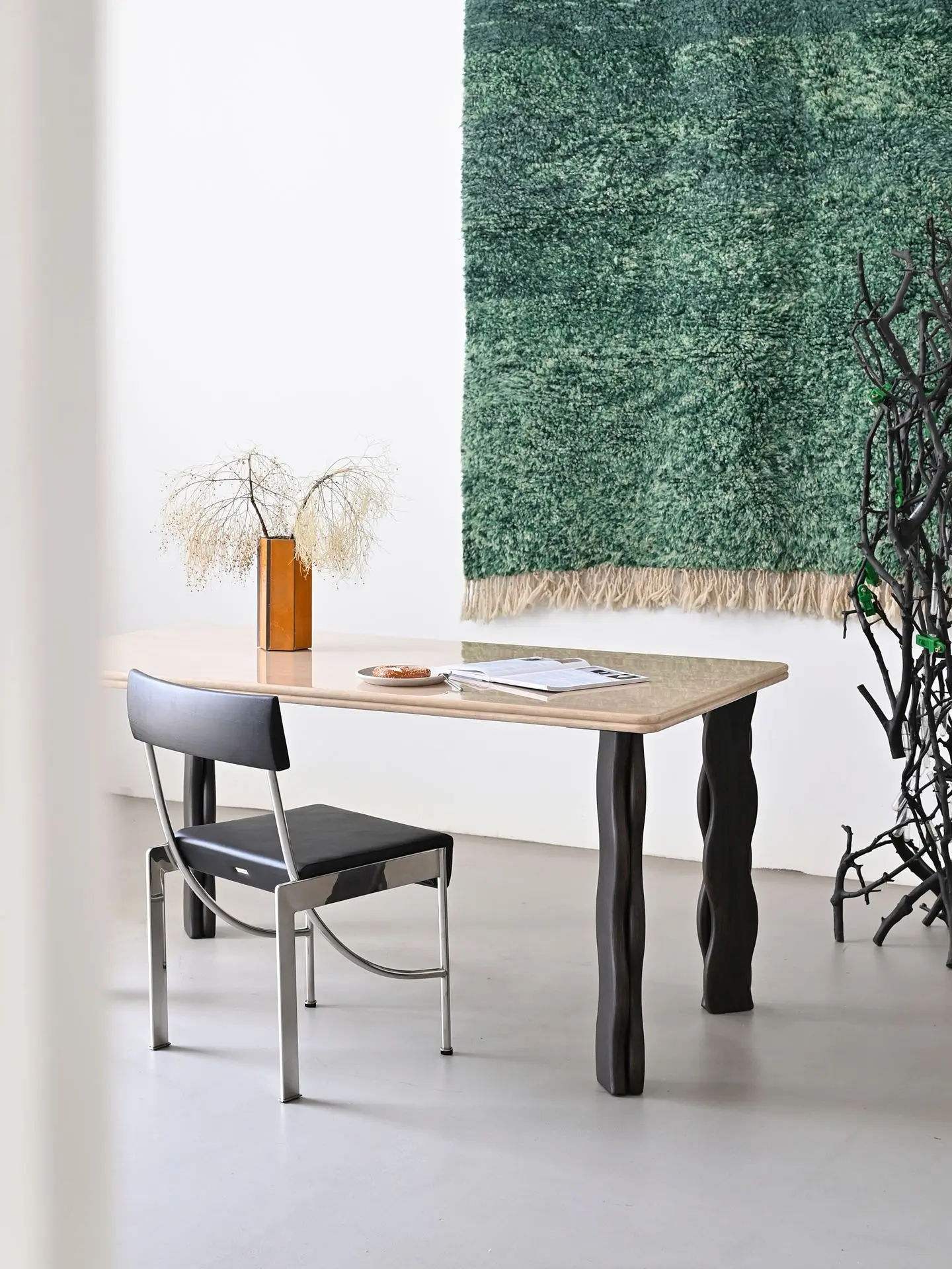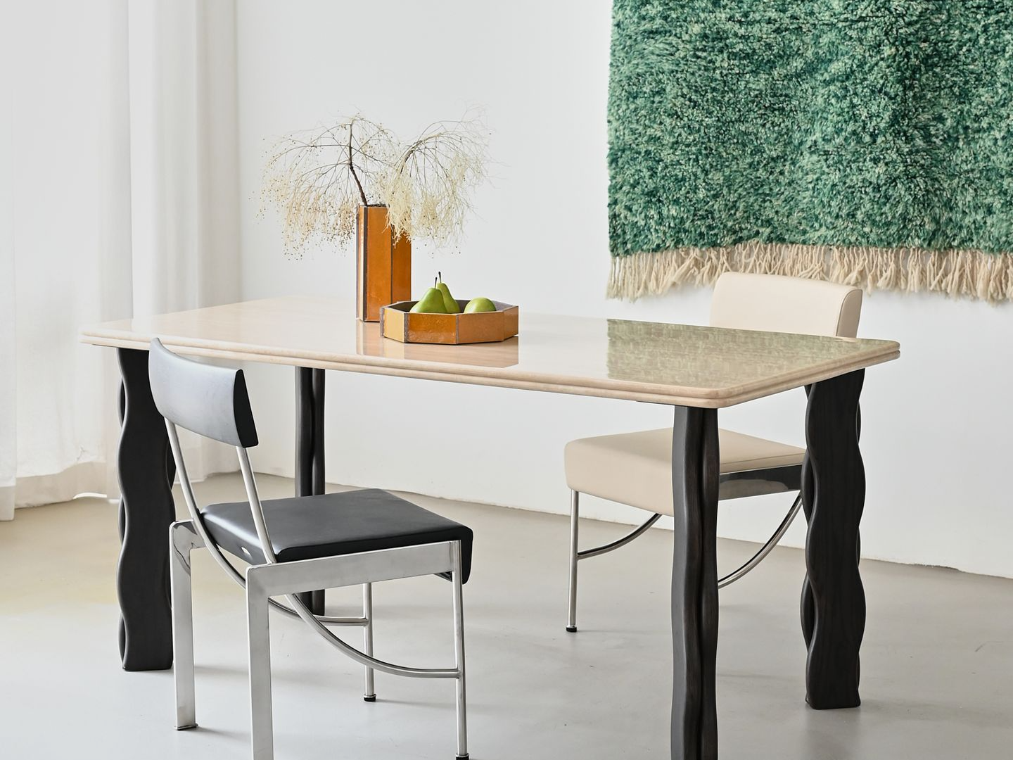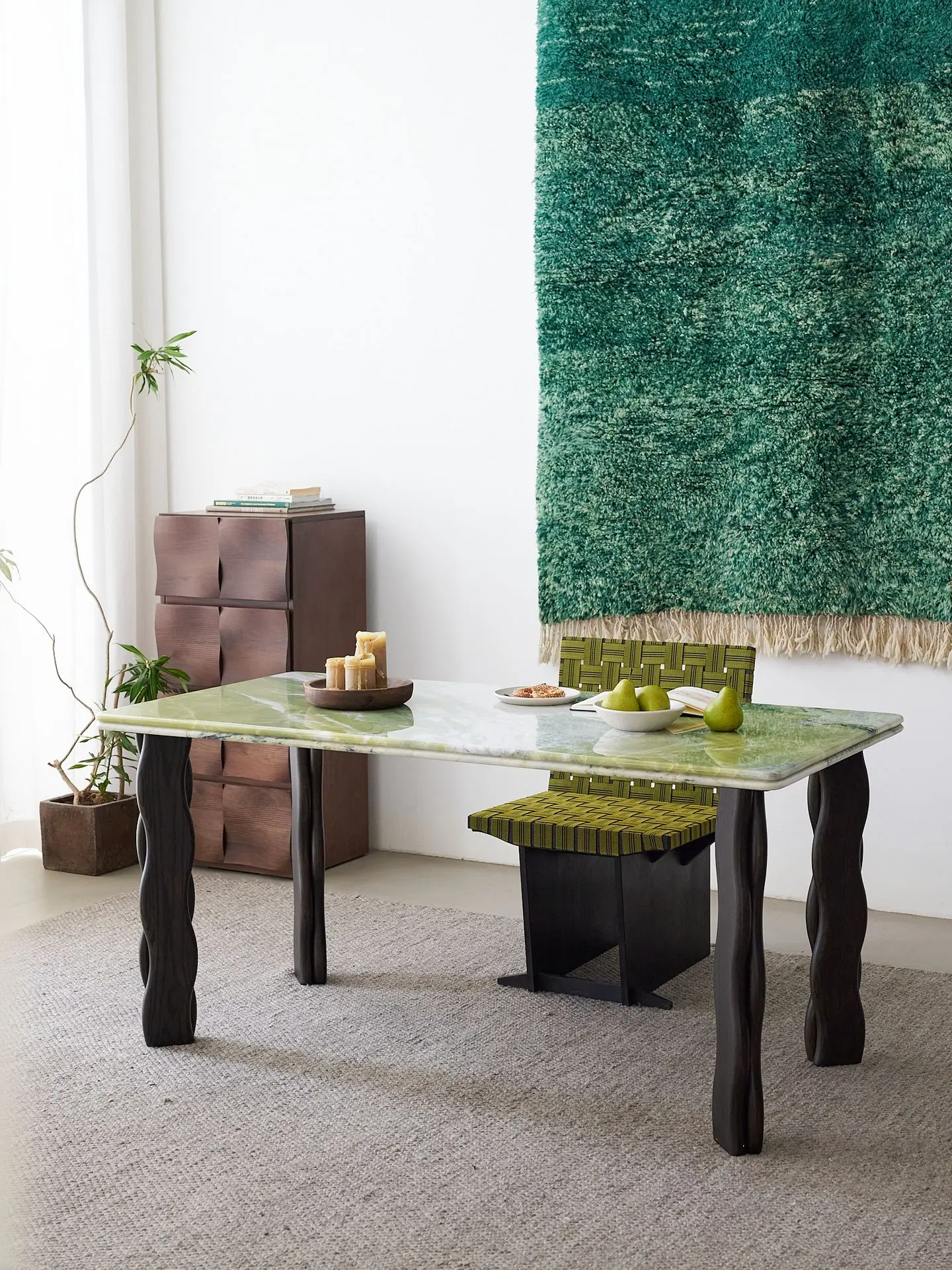 斑斓长桌每个桌腿都由两块块波浪形木材板拼合,构成具有层次感的立体造型,每块木材的曲线均经过细致雕琢,巧妙地捕捉了水波的灵动,仿佛水面在微风中轻轻荡漾,温润木纹结合台面不同天然石材的自然纹理,带来斑斓光影和复古美感。