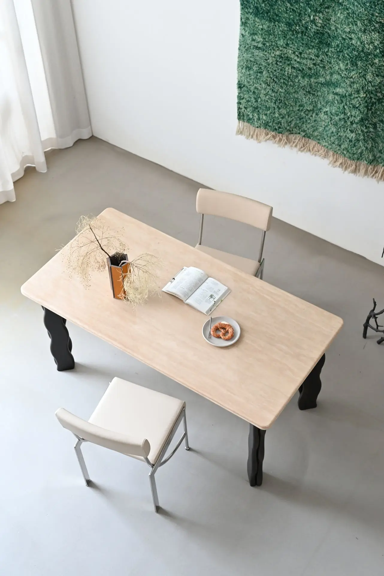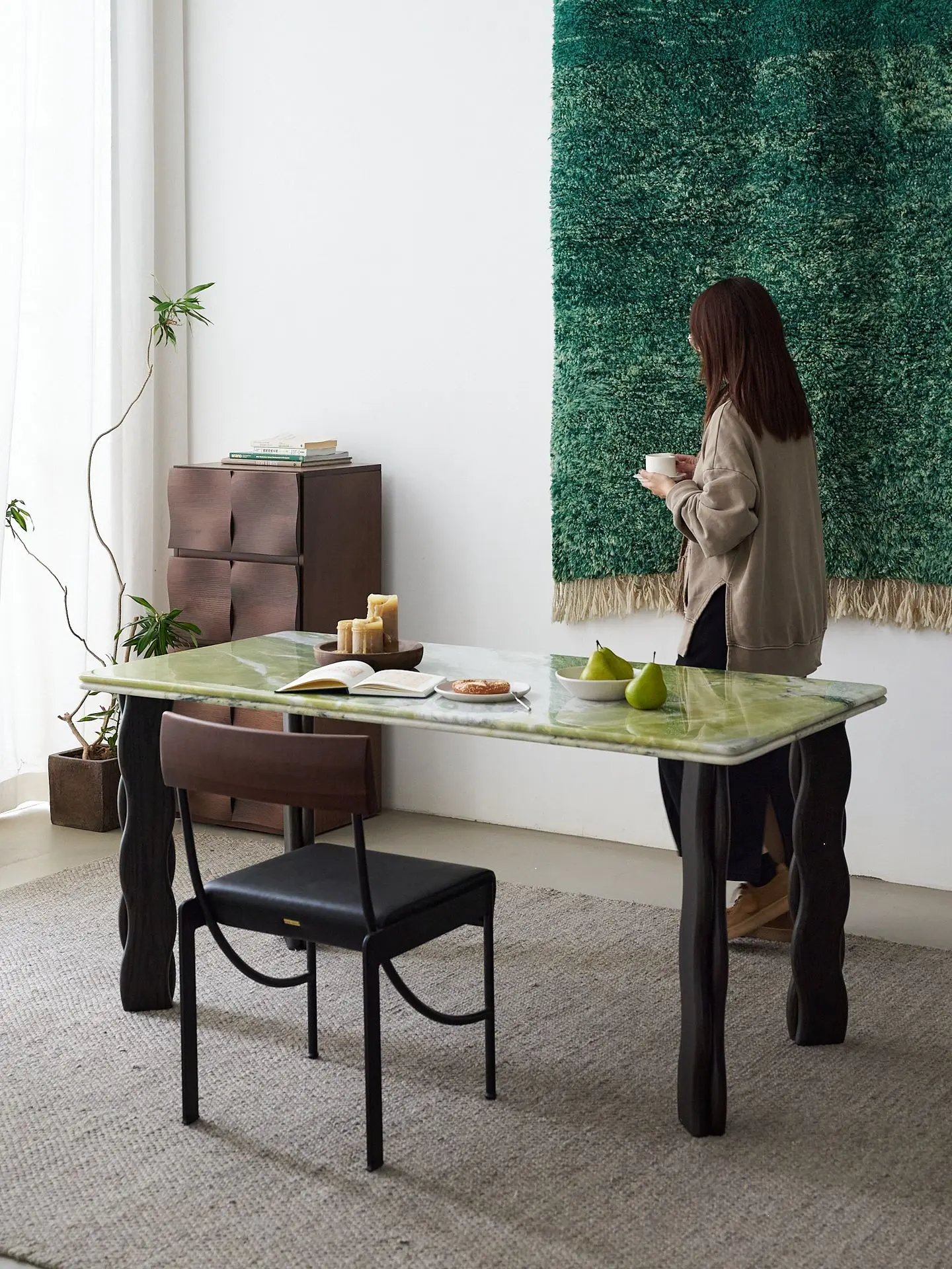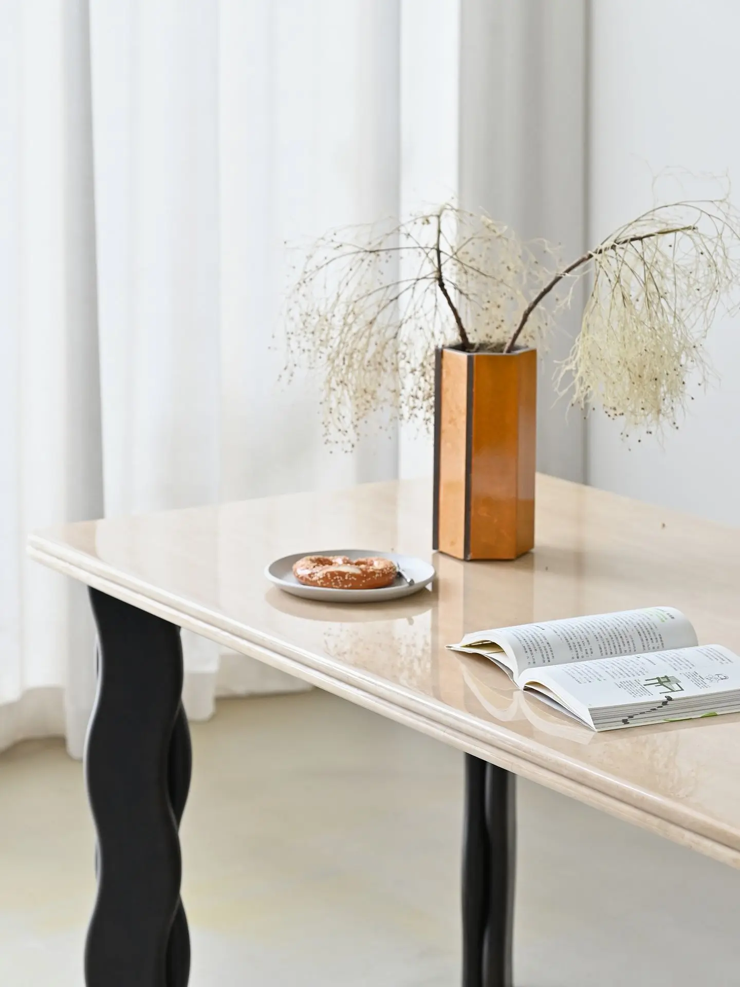 Each leg of the Banlan Dining Table is assembled from two wavy wooden panels, forming a layered three-dimensional structure. The curve of every wooden piece is meticulously crafted to subtly capture the fluidity of water ripples, as if the water surface were gently rippling in a soft breeze. The warm wood grain, combined with the natural veining of the varied natural stone tabletop, creates a play of dappled light and a timeless retro aesthetic.