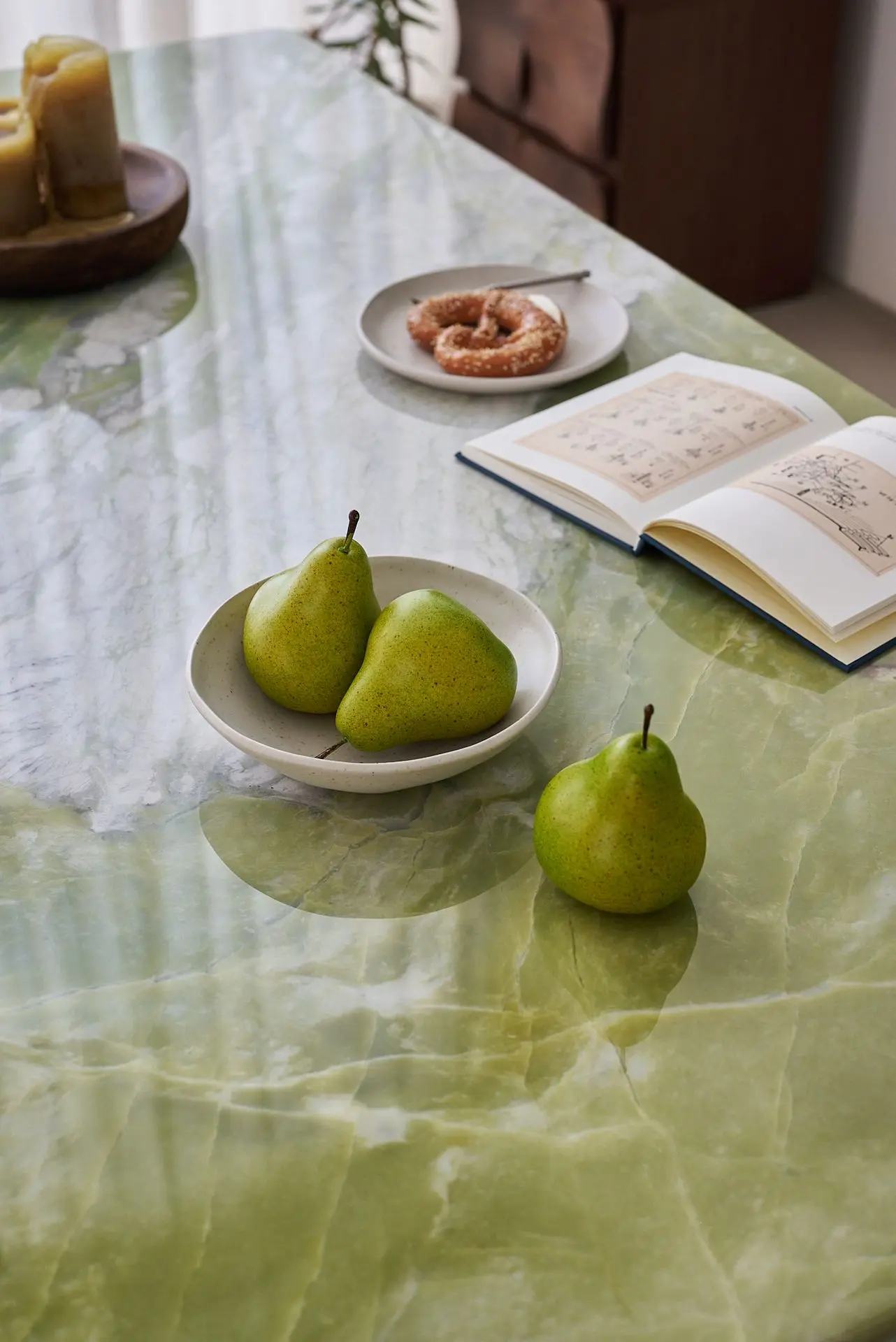 春涧绿石材色泽清新淡雅,宛如山涧初融的冰绿水色,深浅交织的冰透绿,错落有致,凝聚着岁月沉淀的宁静和深邃。每块天然石材原料都拥有独特的自然纹理,使每张茶几都拥有独特的艺术魅力,为空间注入一份清新而温馨的氛围。