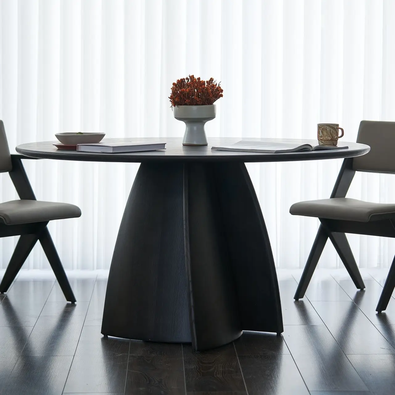 The legs of the Linglong Large Round Table are crafted by interlocking four solid wood blocks with three-dimensional curves, featuring a tower-shaped design that tapers from bottom to top. This structure balances its visual center of gravity exquisitely and endows the table with an elegant, lively sense of dynamic beauty.