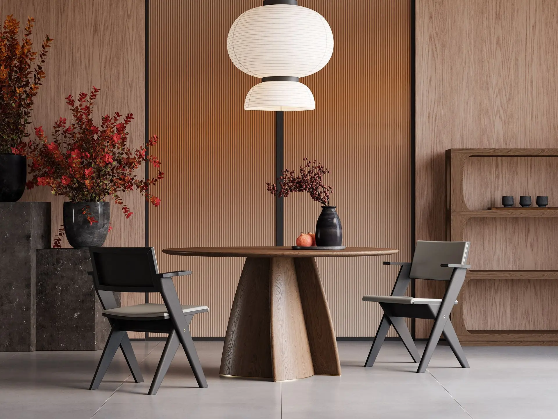 The round table design naturally brings family closer together, while its spacious surface comfortably accommodates hearty meals. When illuminated by warm lighting, the interlocking table legs create rich, layered visual effects, elevating every dining moment with a sense of ritual. Whether gathering to savor tea and conversation or using it as a temporary workspace, the solid wood’s warm, stable presence fosters an atmosphere of refined elegance and comfort.