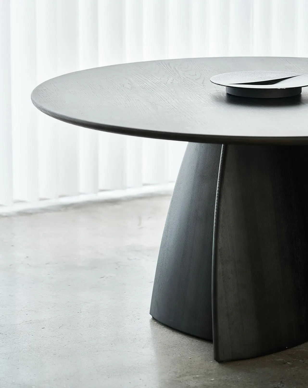 玲珑大圆桌桌腿桌腿由四片带有三维弧度的实木体块交错拼合,上小下大的塔型设计使其视觉重心更为平衡,具有优雅灵动的动态美感。