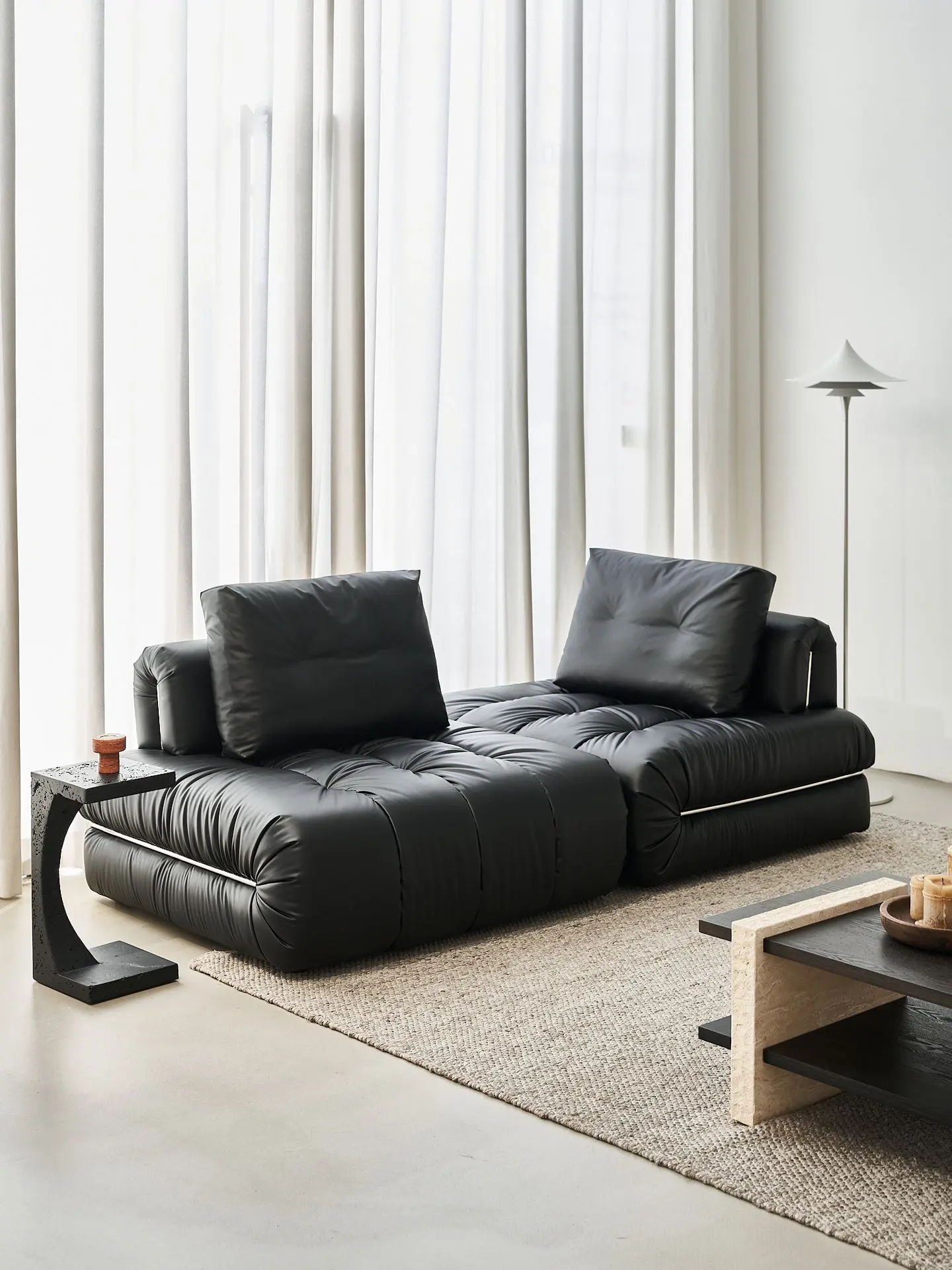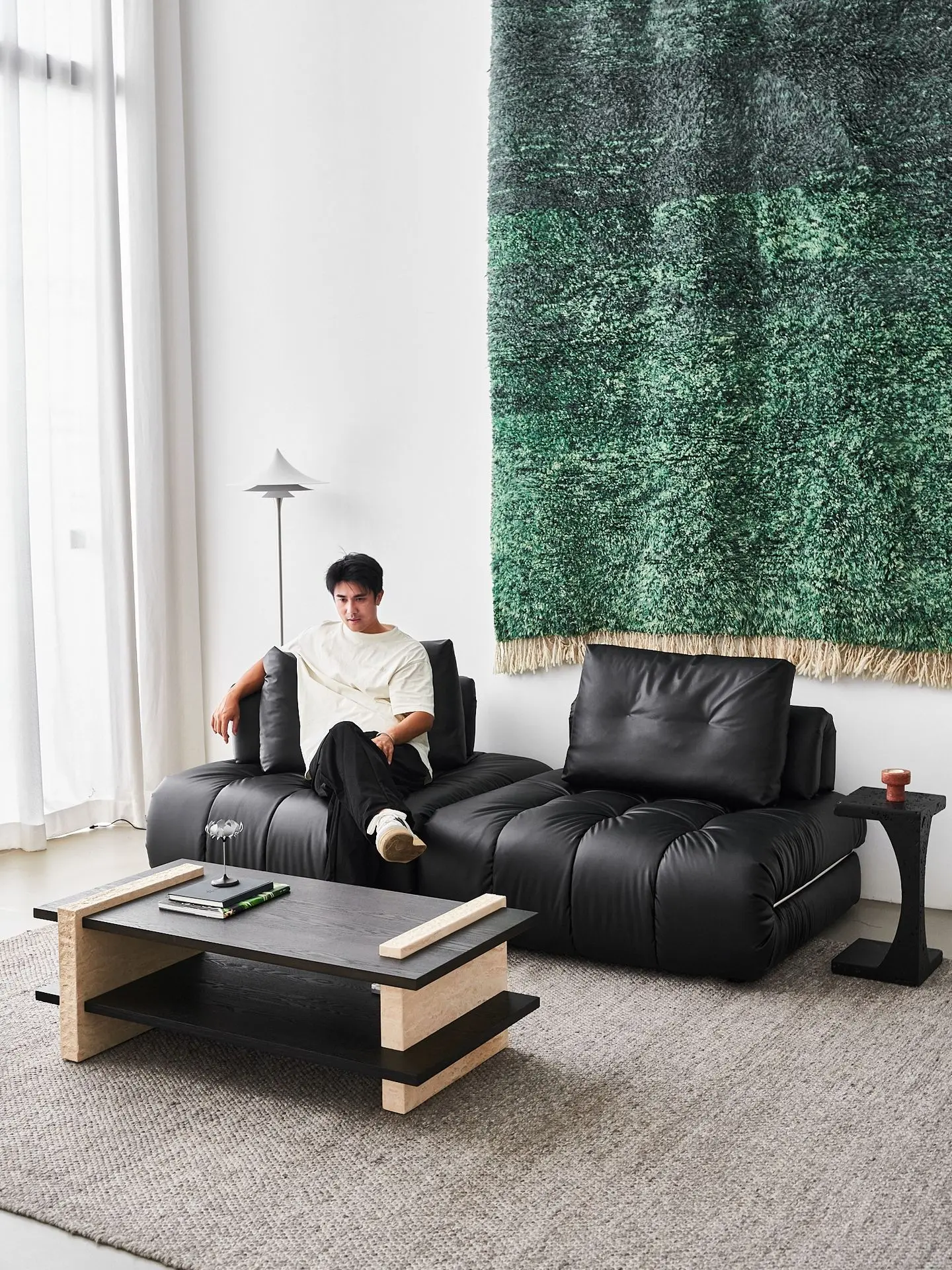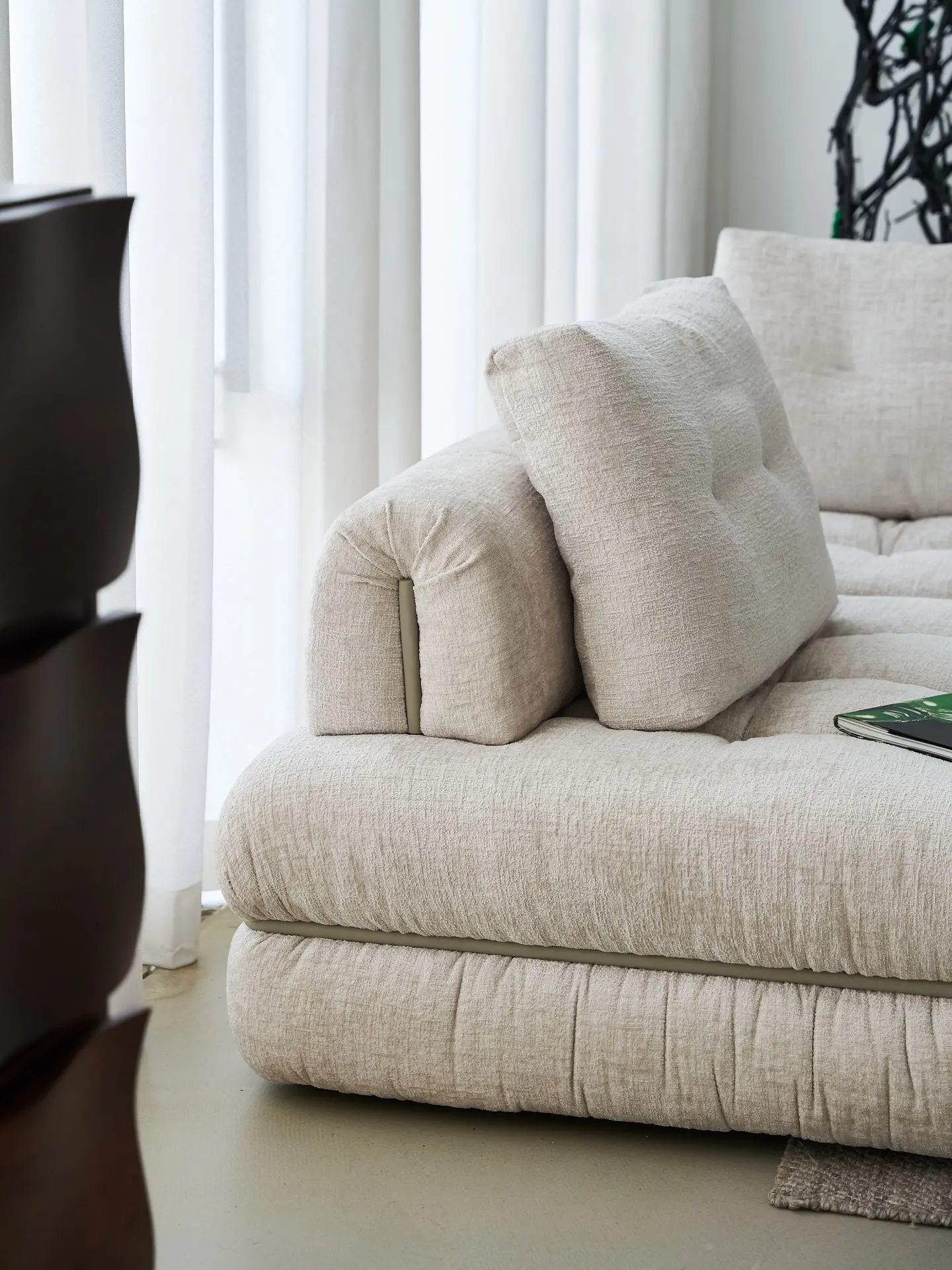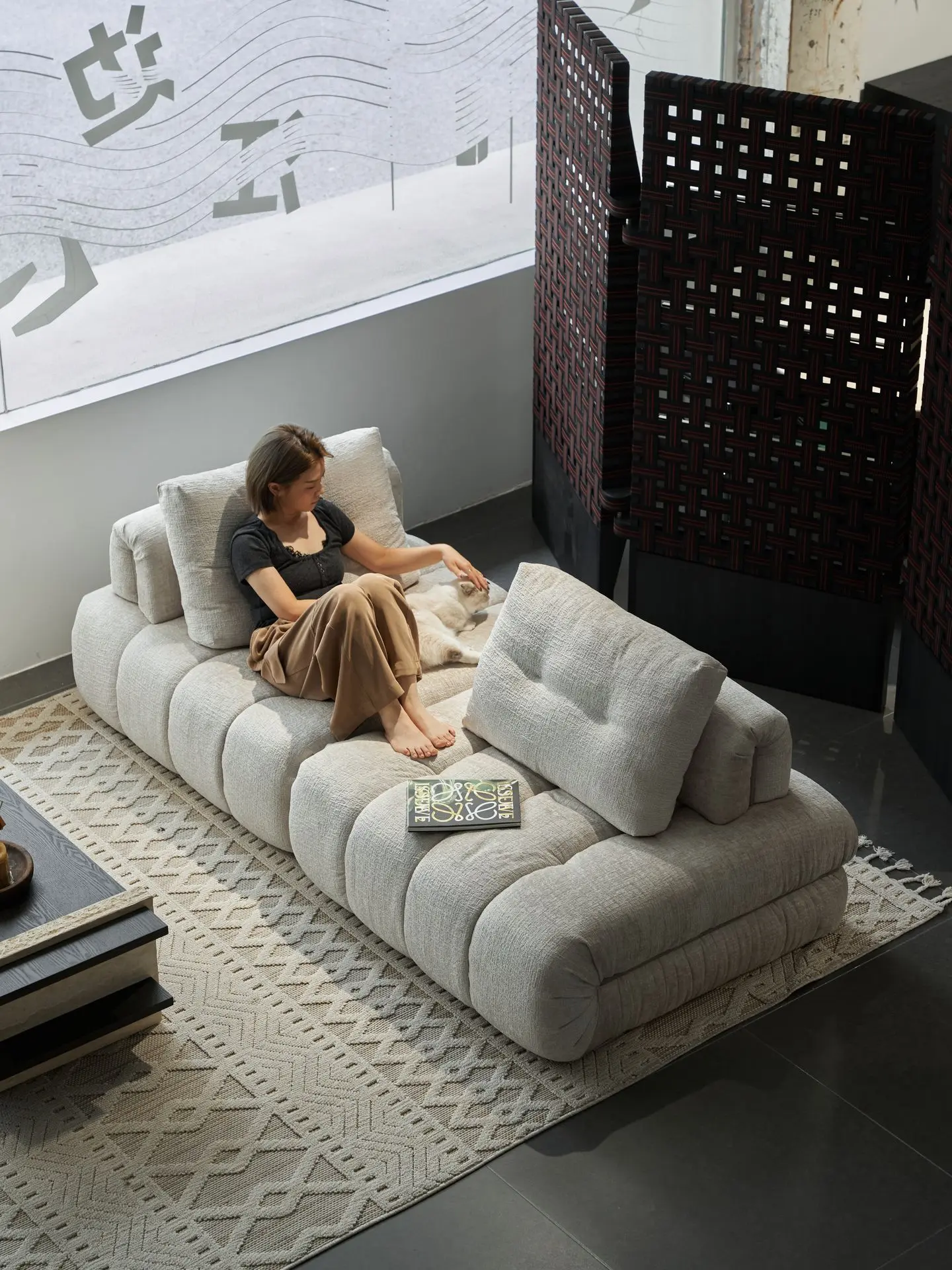 The Shanjian sofa’s back cushions are plush and soft, filled with down and four-sided composite material to fit the back curve perfectly. Movable and adjustable, the cushions accommodate various lazy sitting postures. Remove them, and the sofa transforms into a bed—allowing free lying down for naps.