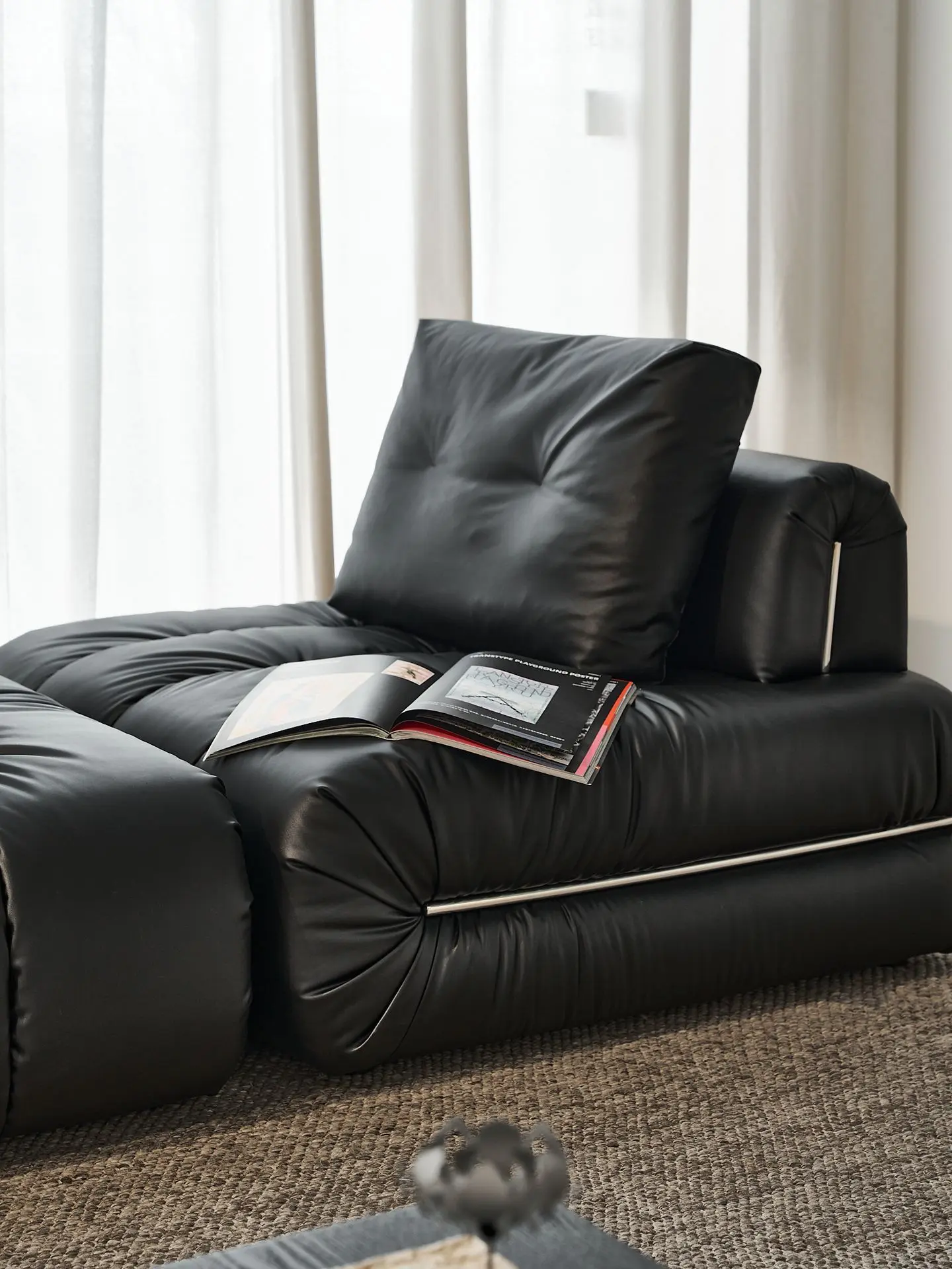 The leather version of the Shanjian sofa features embedded polished stainless steel round tubes on the sides. Paired with leather, it embodies a classic Bauhaus style.