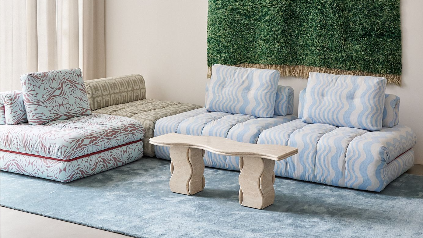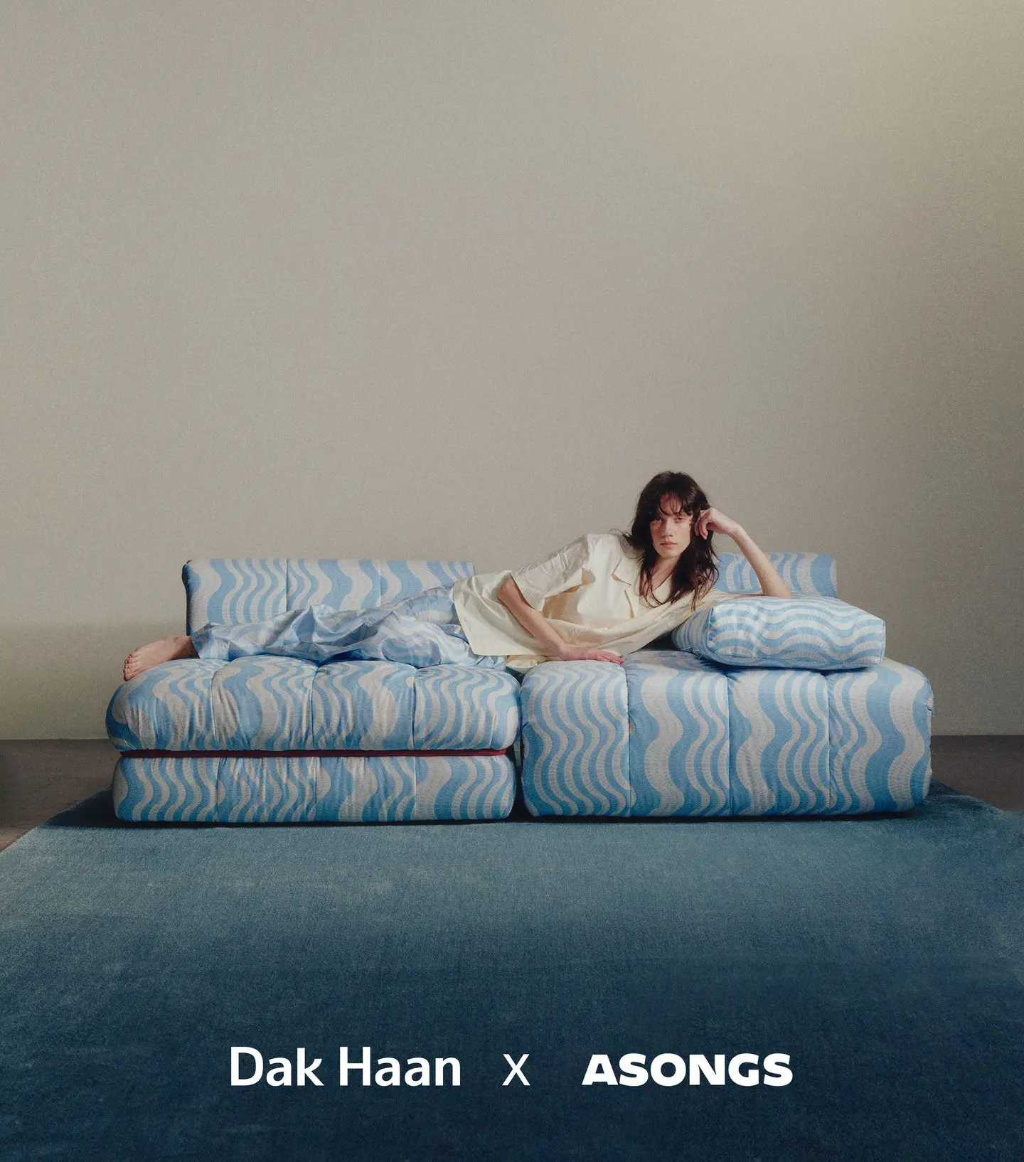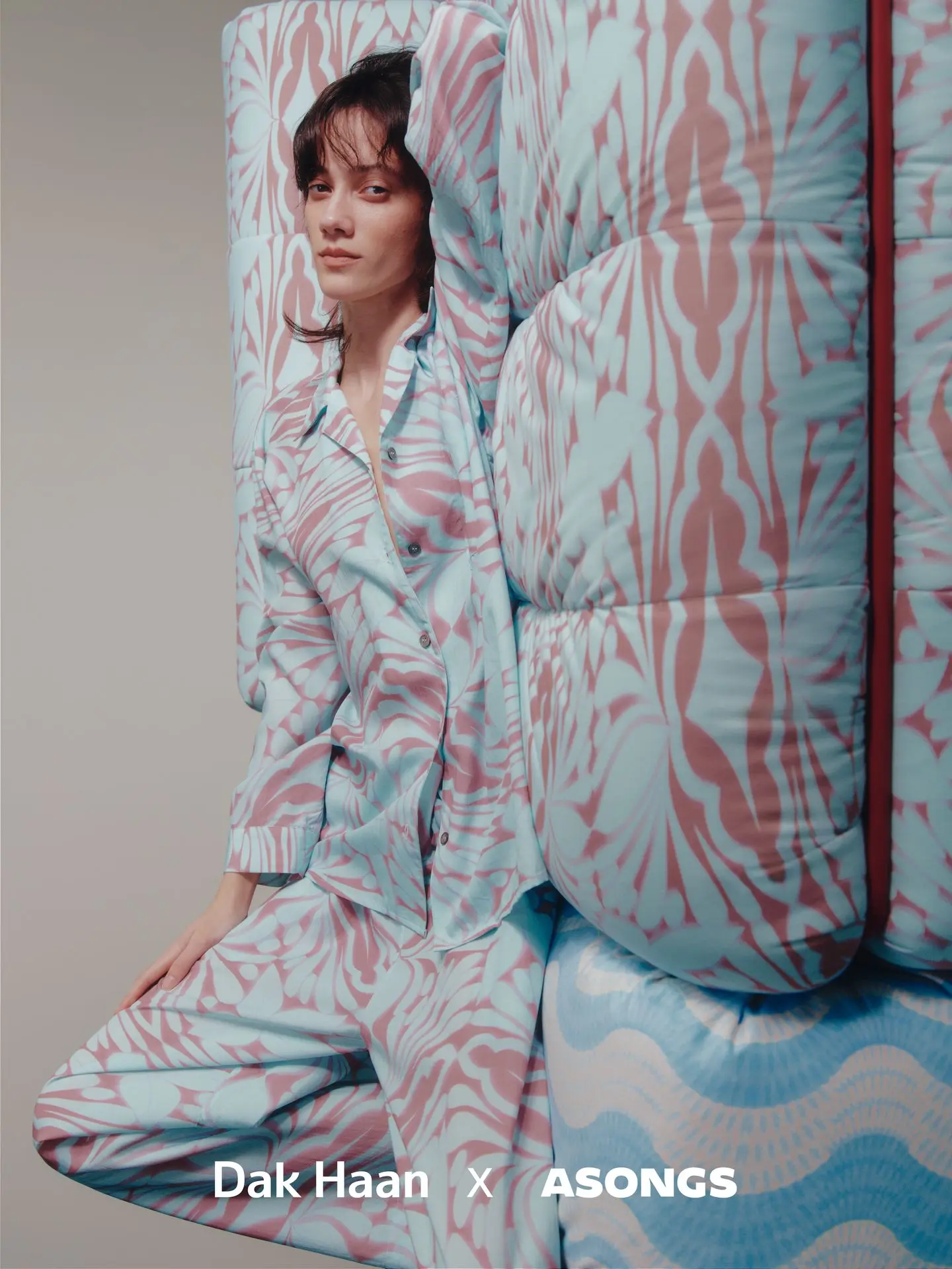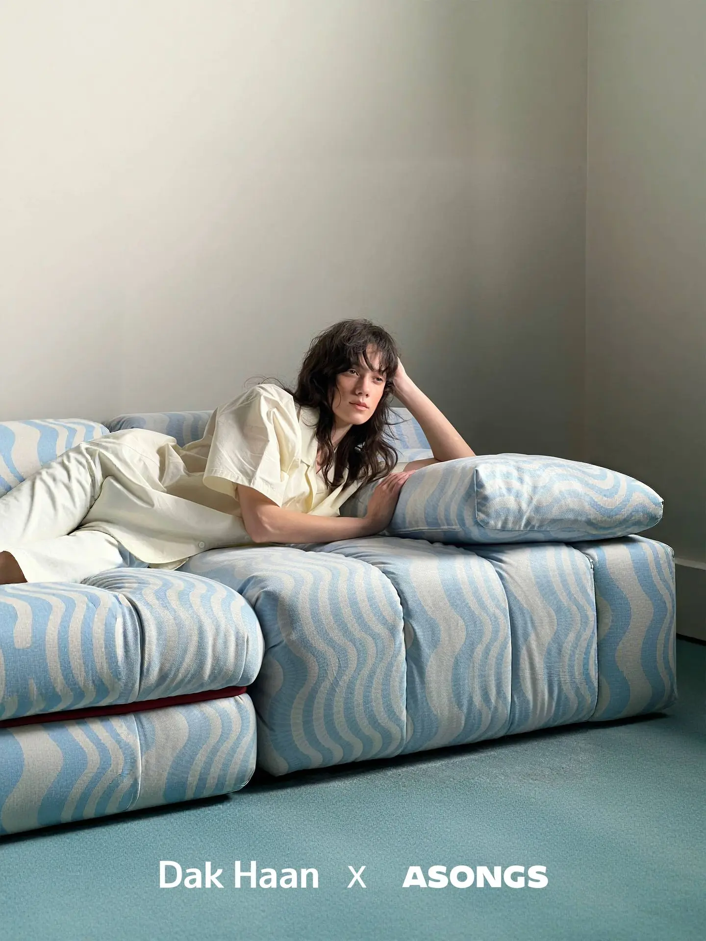 The special printed edition of the Shanjian Sofa, a collaboration between Dak Haan and ASONGS, features nature-inspired printed fabric paired with red leather trims—blending to create an elegant and relaxed aesthetic.