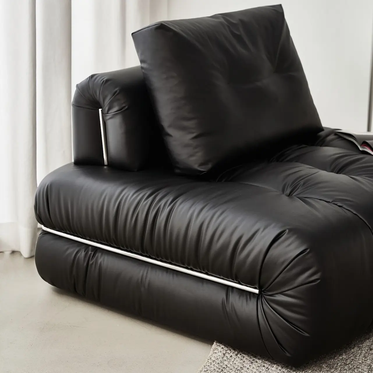 山涧沙发皮革版本侧边为亮面不锈钢金属圆管内嵌装饰,与皮革材质结合,呈现经典包豪斯风格。