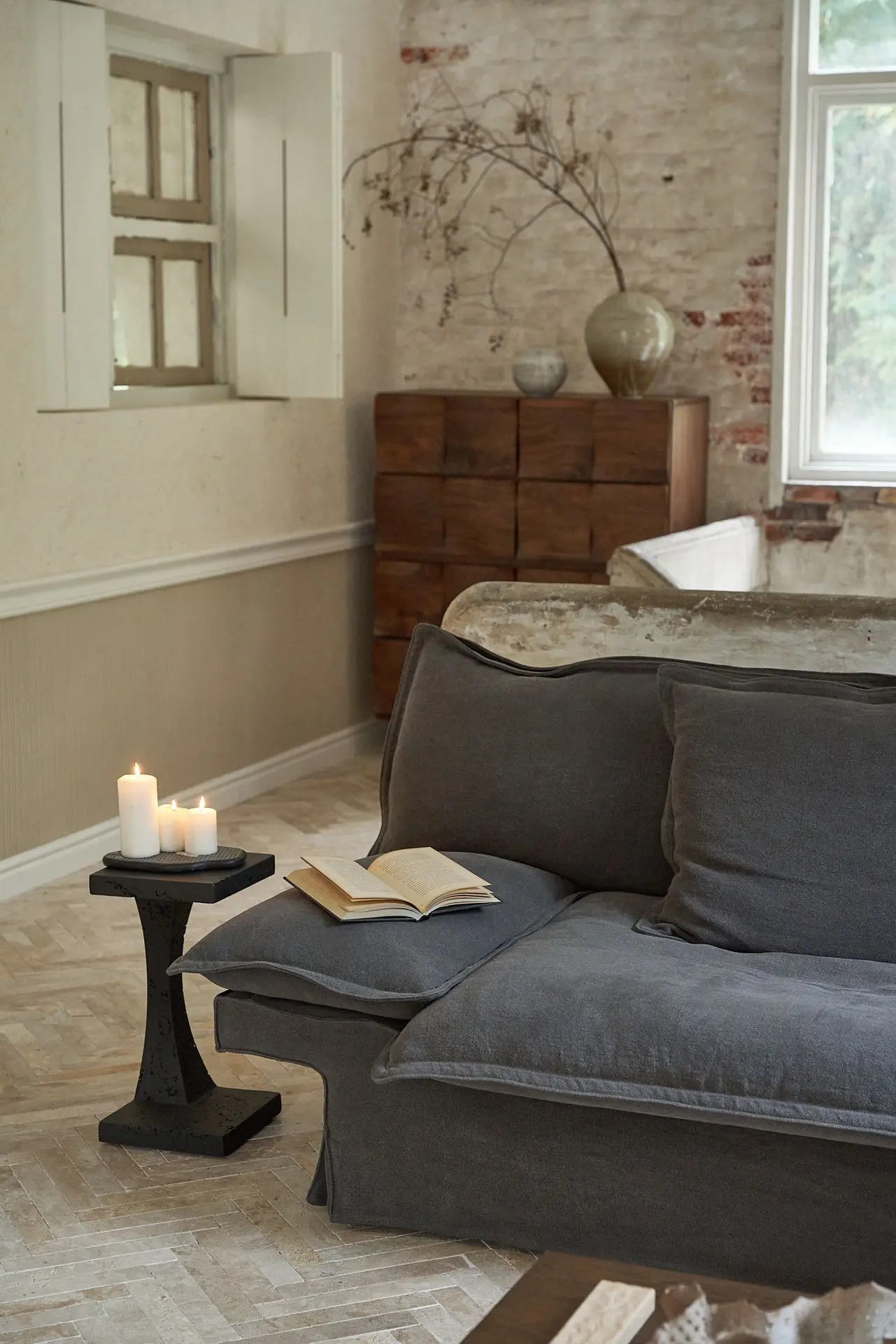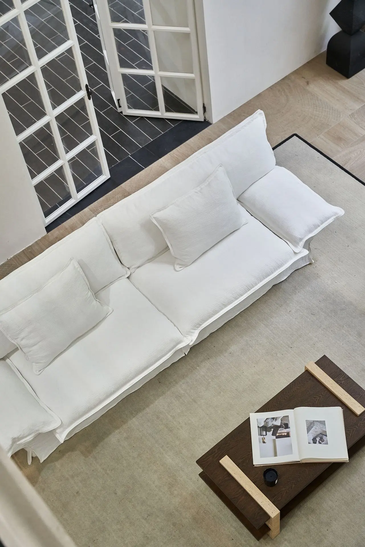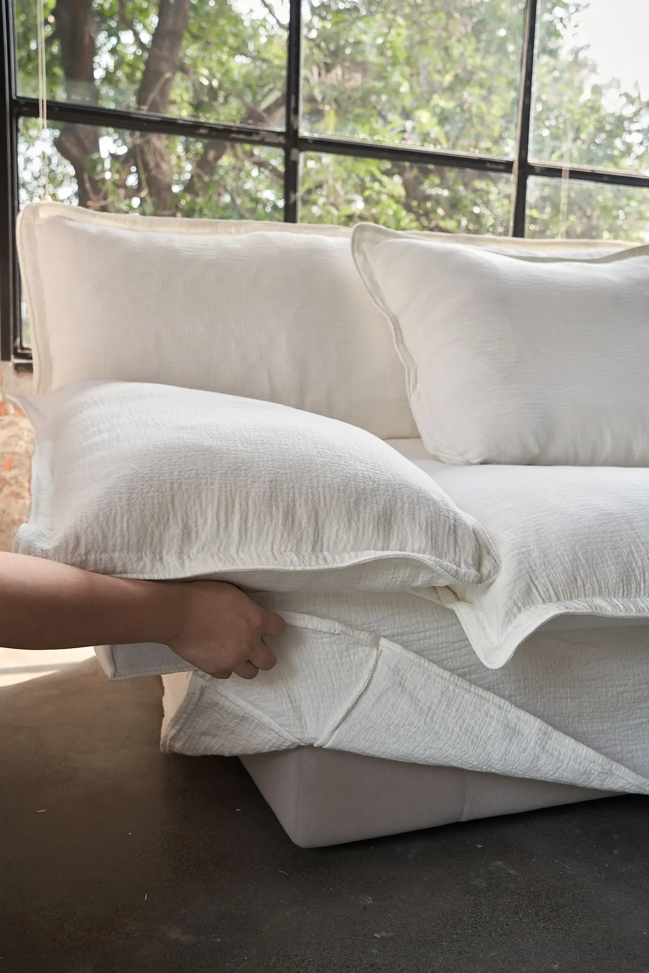 the Yi Fang Sofa emerges as a pavilion-inspired retreat by a tranquil lake—ethereal in form yet meticulously crafted.