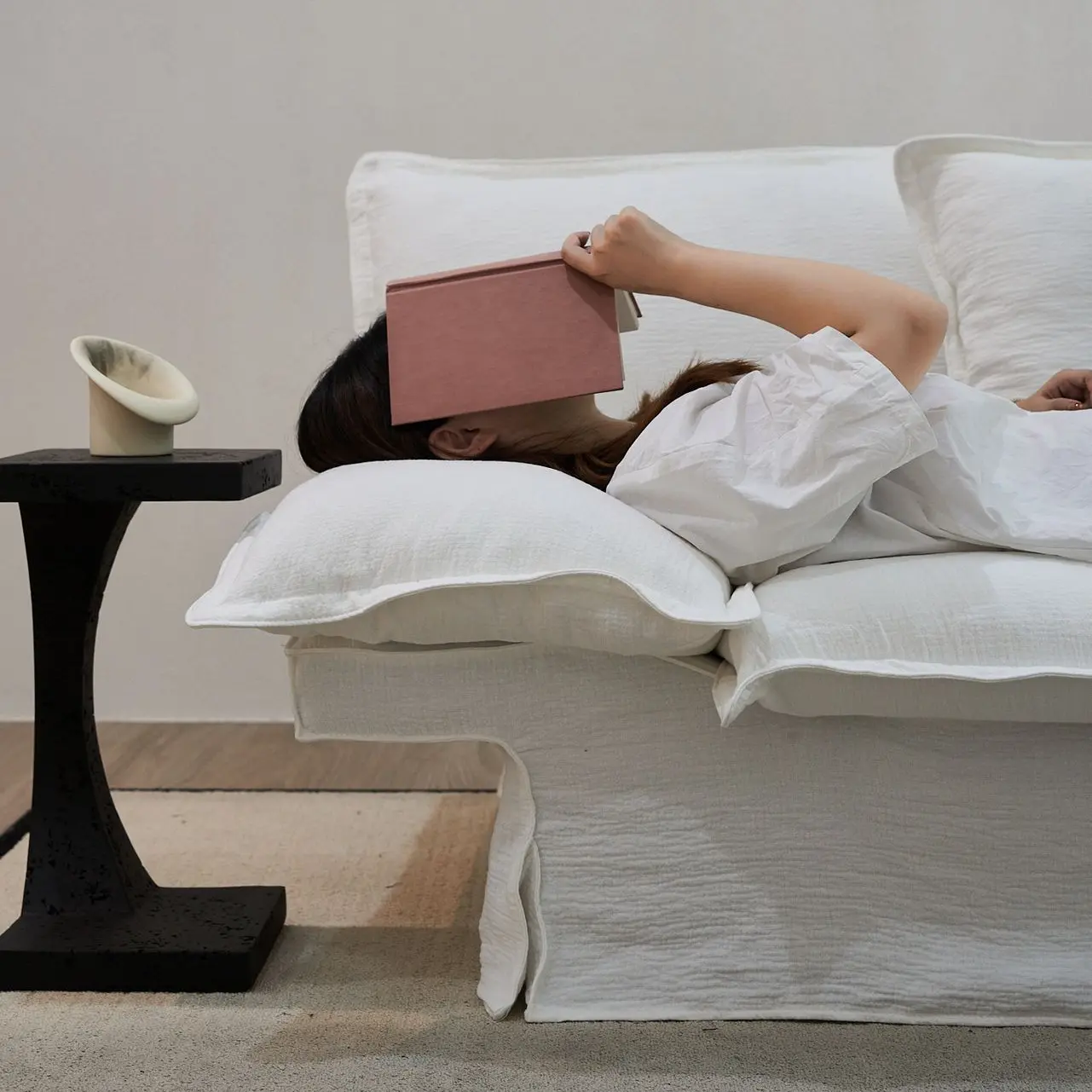 It features a wide and low armrest design—the soft cushion can be repositioned according to usage needs. When lying down, the cushion can double as a pillow; and with the soft cushion removed, the armrest transforms into a small storage table.