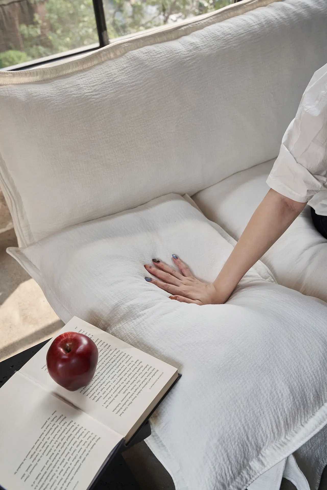宽大和低矮扶手设计,软包可根据使用需求调整位置,躺下时可作为枕头,拿掉软包扶手可作为一个置物小桌板。