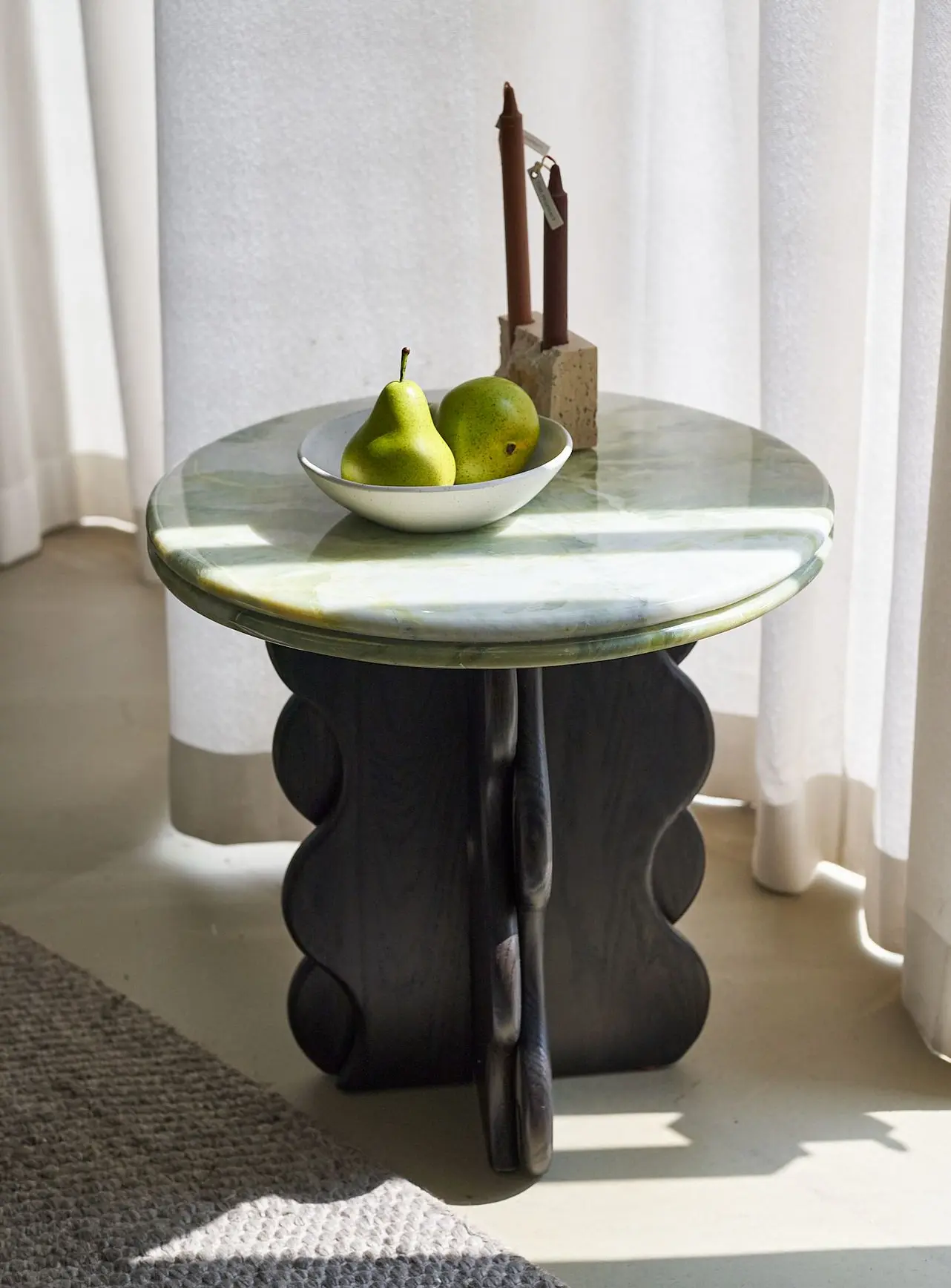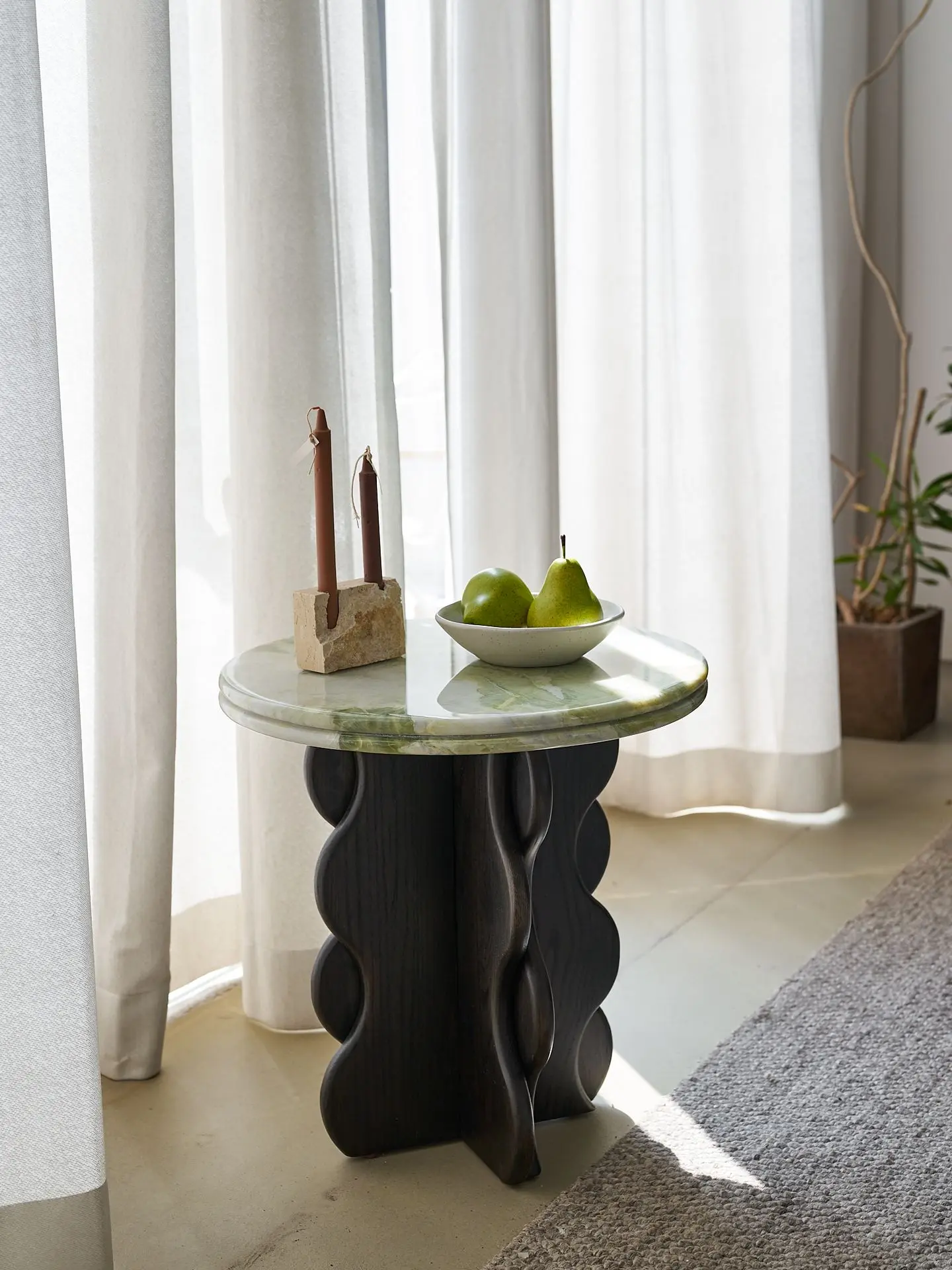 The Banlan Side Table offers a selection of natural stone tabletop options. The organic textures of natural stone paired with the warm solid wood legs create a sleek and elegant visual experience through the striking interplay of materials.